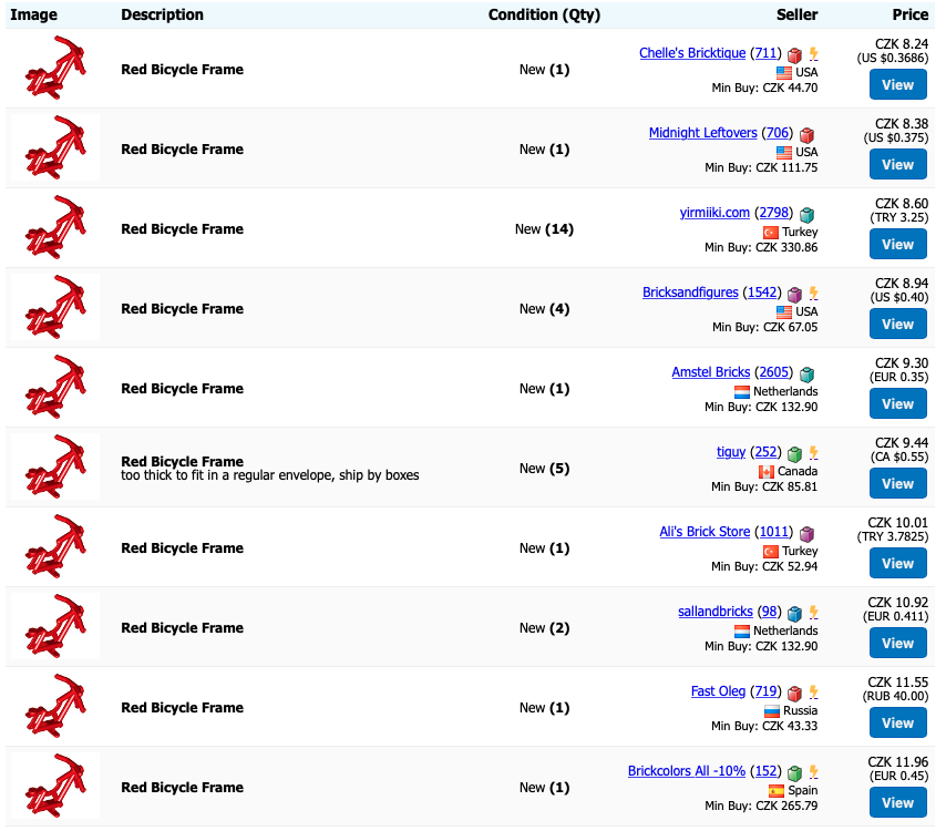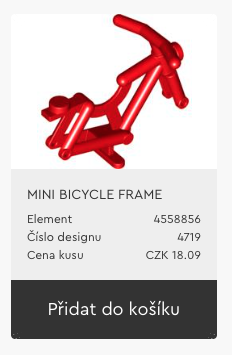 Rám červeného kola na Pick a Brick nenajdete, pomocí Bricks and Pieces si jej můžete objednat za 18,09 Kč, zatímco na Bricklinku jej najdete i o polovinu levněji.