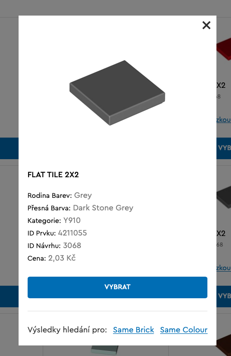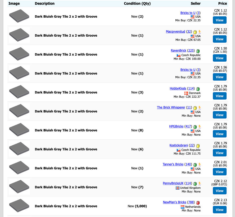Dlaždice 2 x 2 v tmavě šedé barvě patří k těm nejběžnějším LEGO kostkám – na Pick a Brick jednu koupíte za 2,03 Kč, na Bricklinku ji v novém stavu můžete koupit už za 1,12 Kč. Daný prodejce má ale k dispozici pouze dva kusy. Pokud tedy chcete koupit více než 8 ks, musíte k prodejci NewMan’s Bricks, který sice nabízí 5 000 ks, ale již za cenu 2,13 Kč za kus. Pokud k tomu ještě připočtete poštovné z Nizozemí, vyjde vás nákup této kostky ve velkém množství na Pick a Brick výrazně levněji.