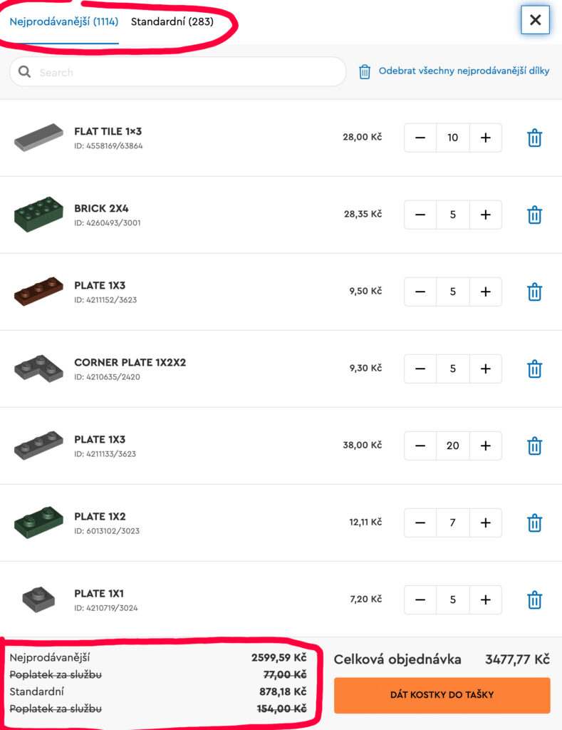 Kategorie „Nejprodávanější“ obsahuje kostky, které jste si dříve mohli koupit na Pick a Brick. Dílky jsou odeslány ze skladu z Polska a dorazit by vám měly do 7 dnů. Nový je také poplatek za službu ve výši 77 Kč pokud nakoupíte za méně než 298 Kč.