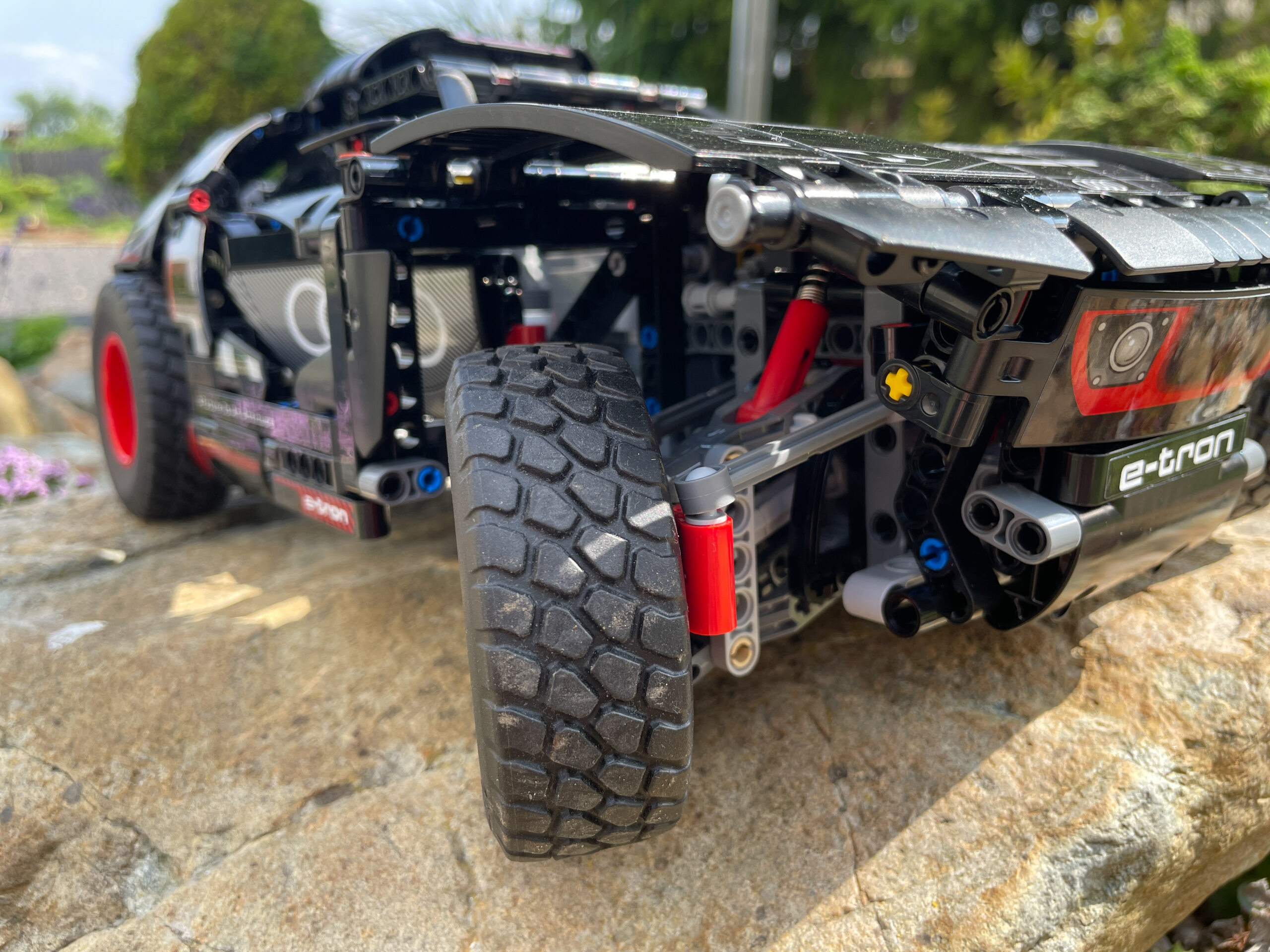 E-tron má pohon na všechna 4 kola. Každou z dvojic kol roztáčí vlastní motor. Třetí motor slouží k zatáčení. Na obou nápravách je umístěn diferenciál. Dokonalou přilnavost pneumatik k povrchu má na starost nezávislé zavěšení kol, při jehož stavbě jsem se opět přiučil něco z reálného světa automobilismu. Vepředu jsou tlumiče měkčí a s větším zdvihem než vzadu. Set 42160 se navždy zapíše do srdcí všech stavitelů všemožné stavební i vojenské techniky. Přináší totiž zbrusu nové pneumatiky, které budou ve zmíněných případech konečně vypadat dobře. Jsou větší, ale stále pasují na klasické Technic disky. Finální rozměry modelu jsou přes 37 cm na délku, 19 cm na šířku a 15 cm na výšku.