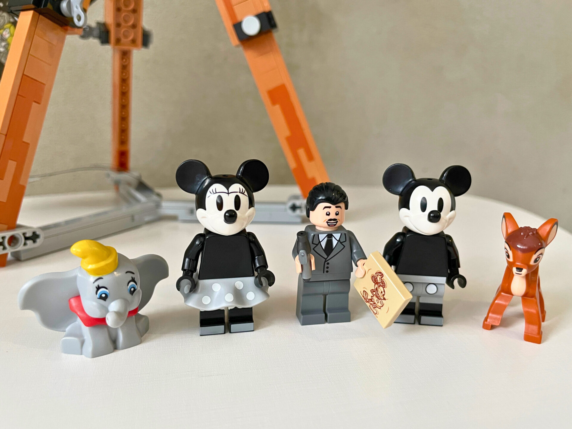 Celá stavbička poslouží zároveň jako místo, kam umístit 3 minifigurky (Walt Disney, Mickey Mouse a Minnie Mouse) a 2 postavičky (Bambi a Dumbo). Legendární tvůrce a podnikatel je oblečen v šedém obleku. Jeho doplňky tvoří pero a skica Mickeyho. Myšky svým ošacením v šedé barvě odkazují na první černobílé příběhy. Bambiho a Dumba bych s klidem vynechal, ale jejich přítomnost samozřejmě potěší.