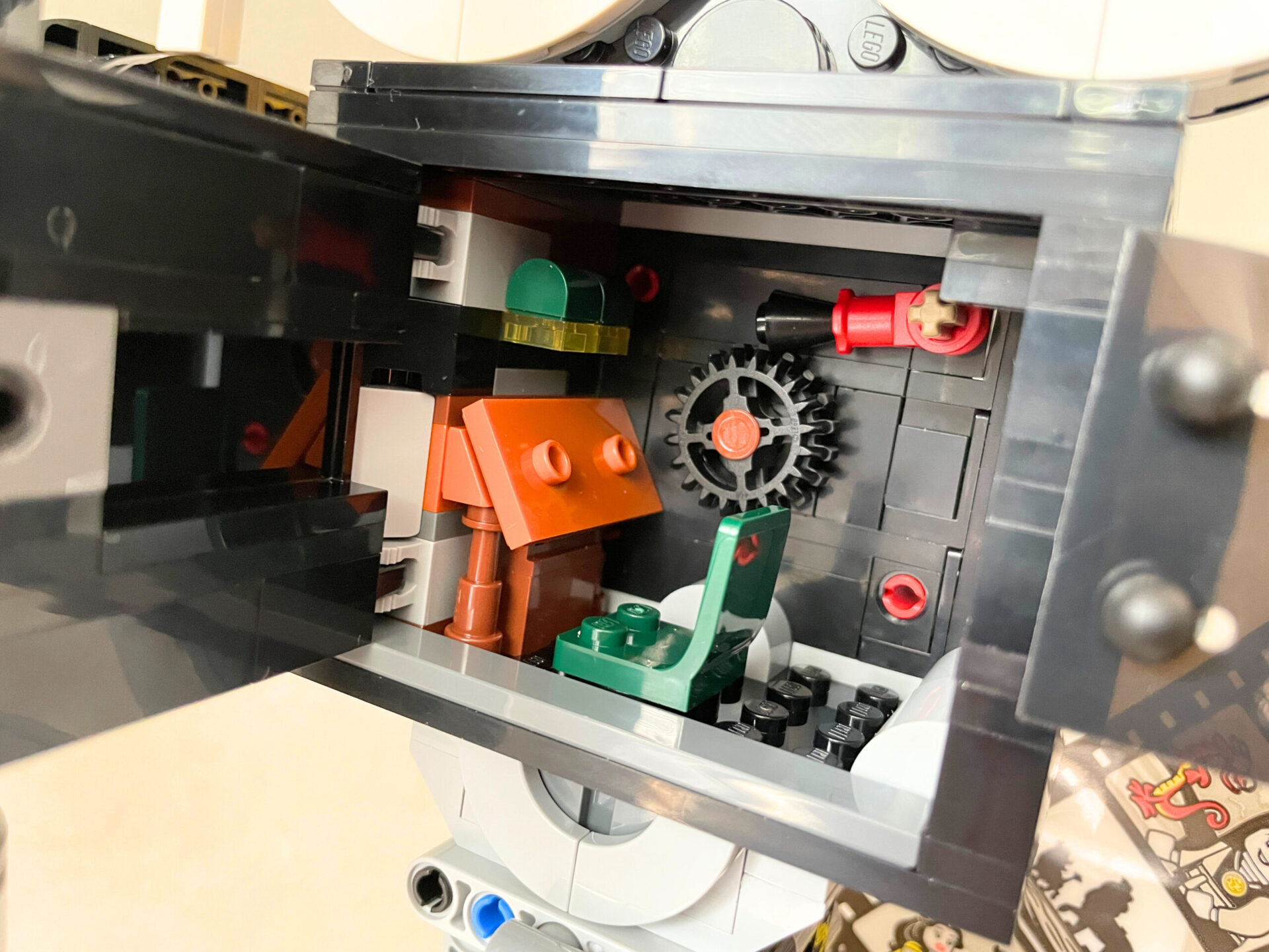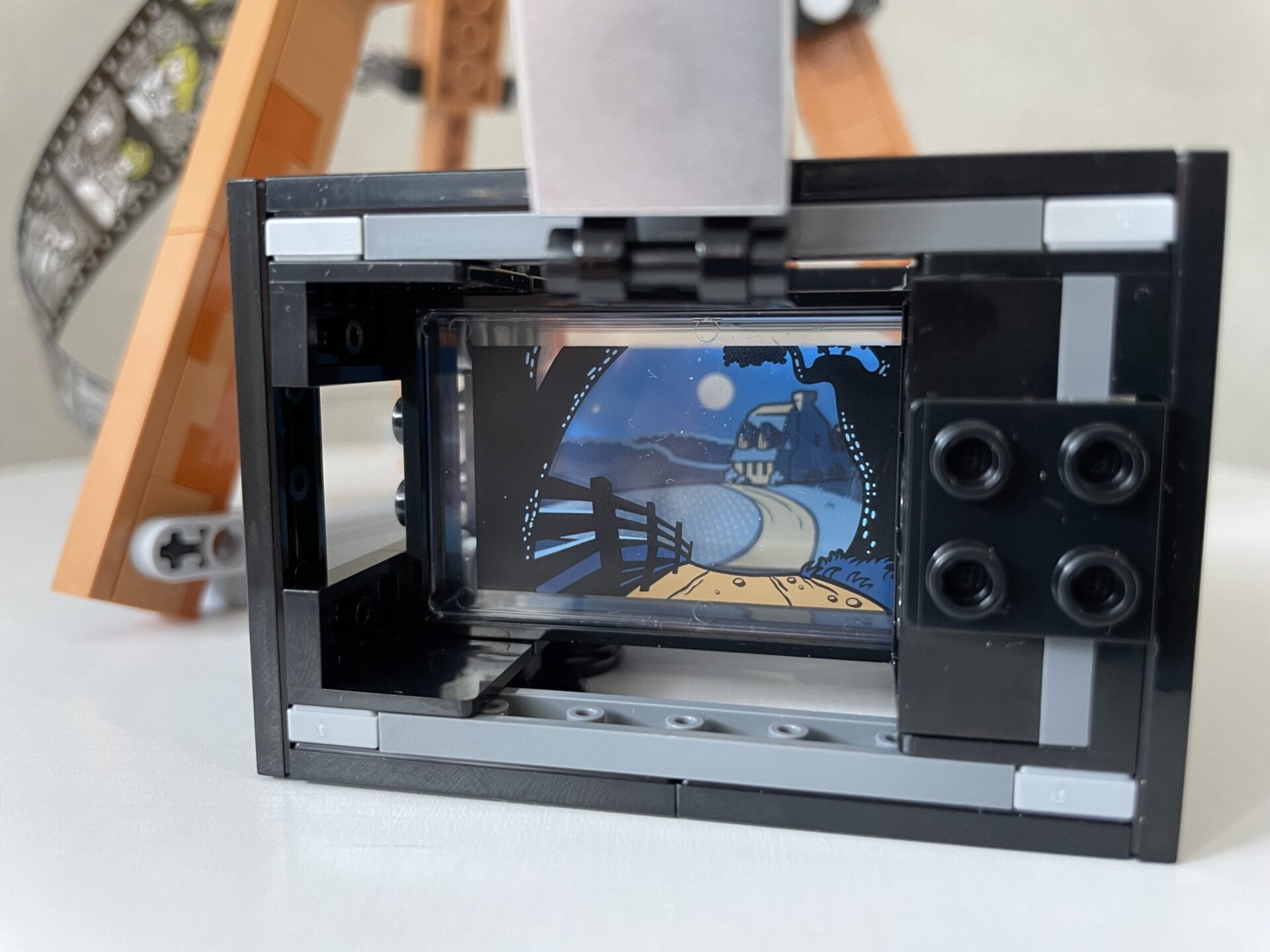 Nejprve se pod vašima rukama zhmotní sekundární model tzv. multiplánové kamery umístěný na podstavci ve tvaru filmové klapky. Tato technika funguje tak, že se na skleněné desky nakreslí různé vrstvy pozadí a ty se rozmístí v určitých vzdálenostech za sebe. Ve výsledku je tím vytvořen prostorový dojem obrazu. Motiv, který výrobce zvolil pochází z filmu Starý mlýn. Průhledné potisknuté destičky LEGO bohužel přihodilo k ostatním dílkům, což si přímo říká o problém. V mém případě se na jedné z nich kousek barvy odloupl, ale naštěstí je zakryt další vrstvou obrazu.