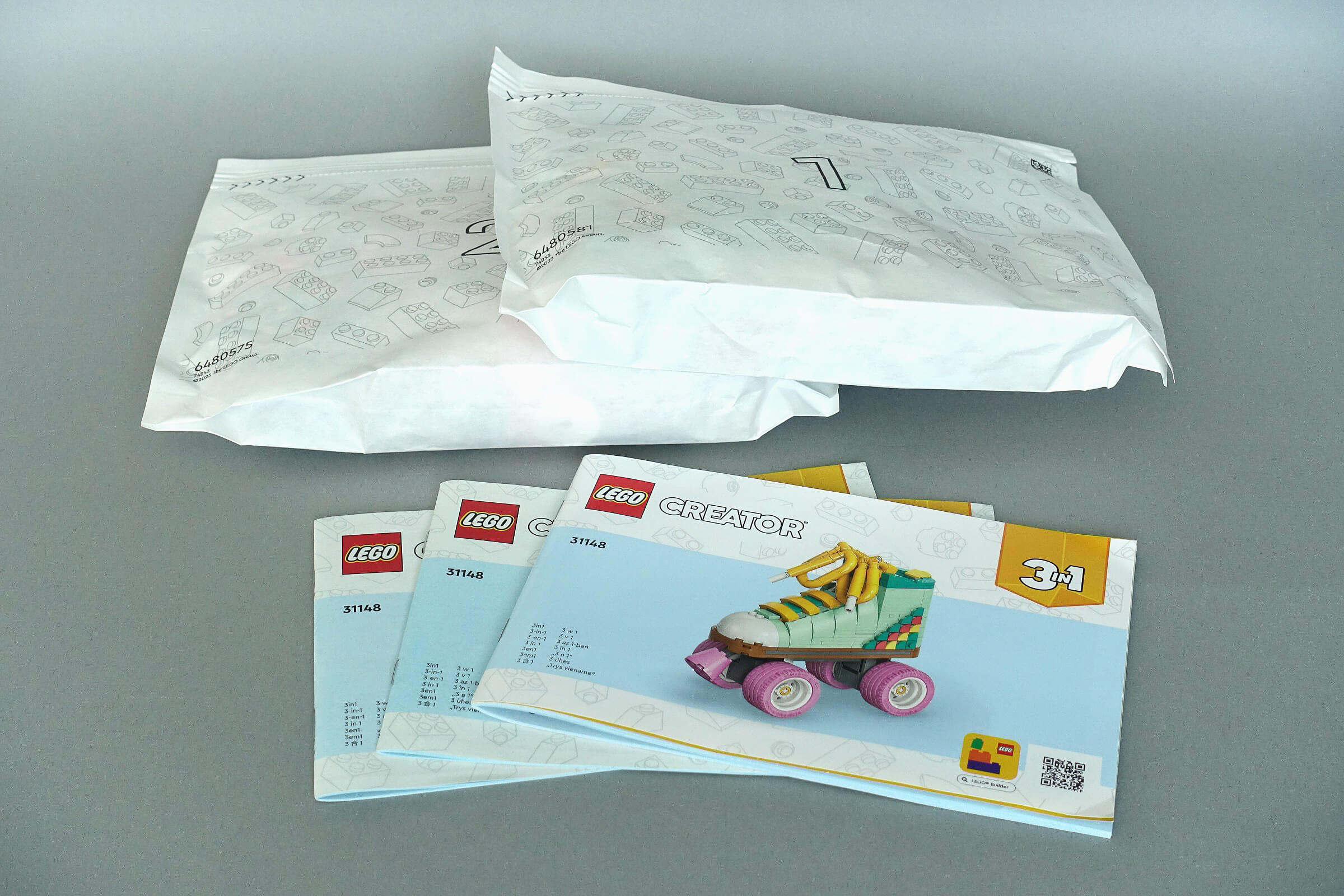 Set 31148 má v českém překladu poněkud zavádějící název říkající, že se jedná o kolečkové brusle (množné číslo), ale kostky jsou v jedné stavebnici pouze na jednu brusli. Krabice je téměř čtvercová a přijde mi zbytečně velká vzhledem ke svému obsahu a v porovnání s hotovým modelem.