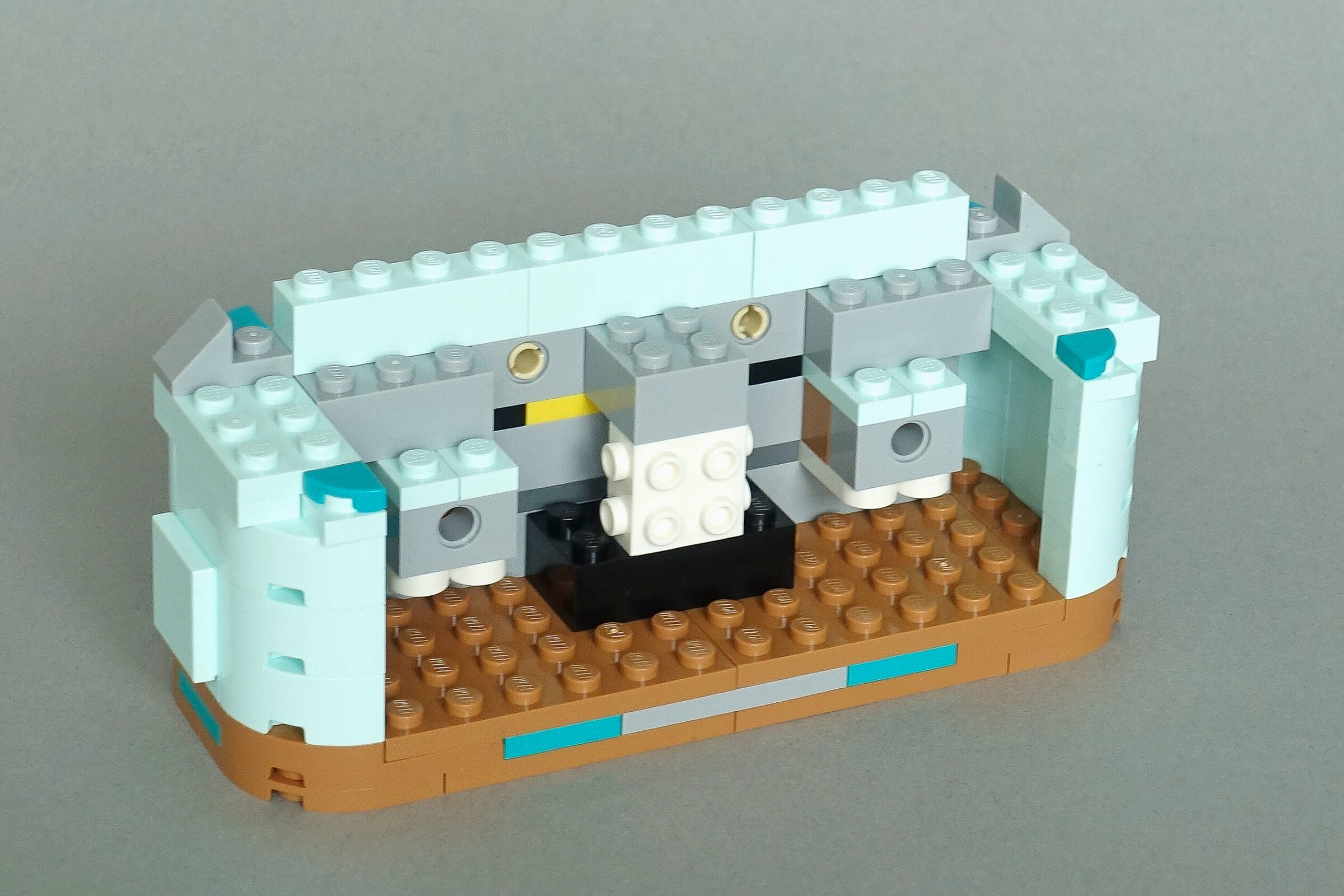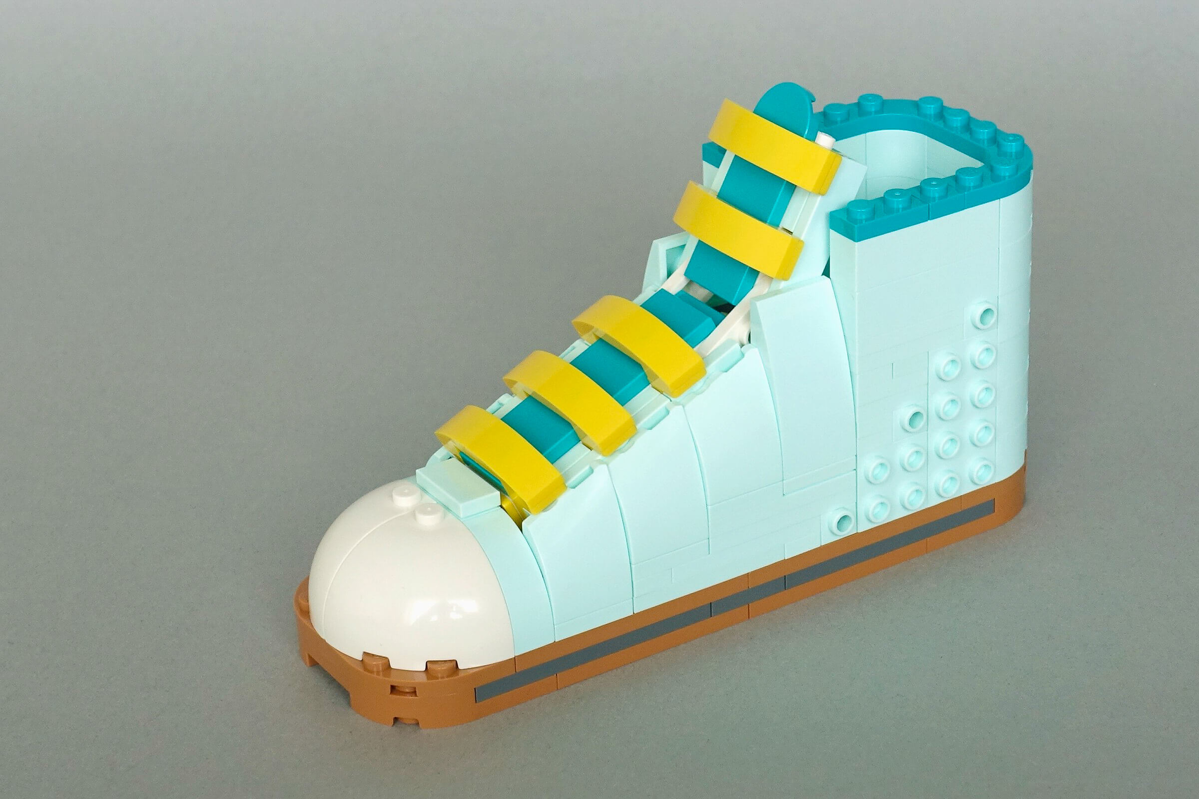 Pojďme začít stavbou hlavního modelu – kolečkové brusle. Stavba je podle pytlíků rozdělená do dvou částí. V první části stavíme vlastní botu. Začínáme hezky od podrážky, pokračujeme špičkou, do které poté vložíme část s jazykem. Tato část je stavebně hodně zajímavá, protože se tu ve velkém používá technika SNOT (z anglického Studs Not On Top, volně přeloženo jako čudlíky do všech stran).
