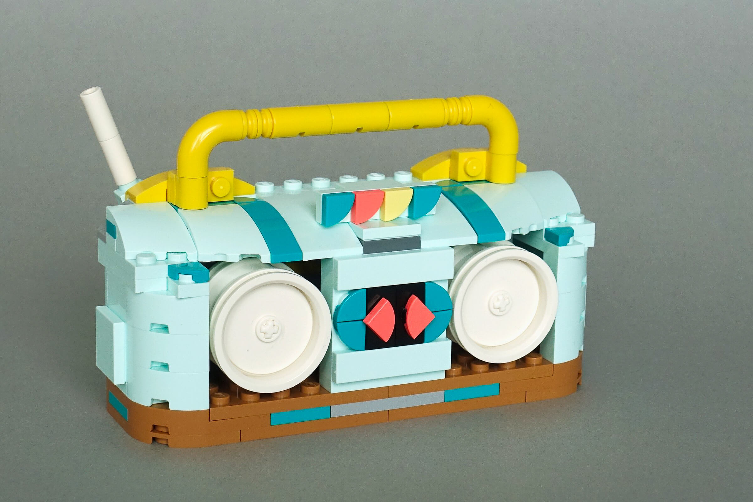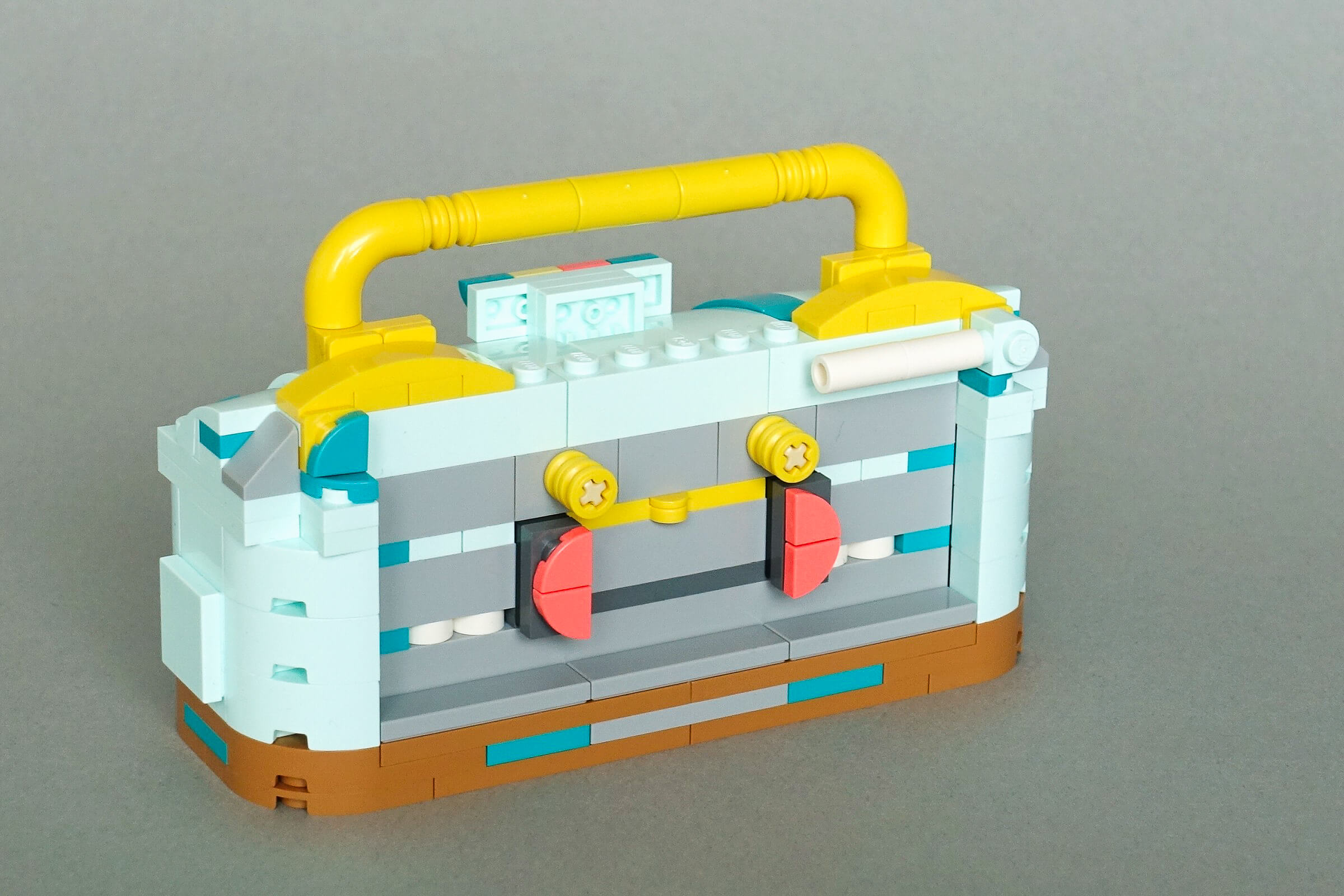 Druhým modelem je klasické rádio jako vystřižené z devadesátých let. Spíše, než ikonické dvojče, jde o kazeťák na jednu kazetu nicméně se dvěma reproduktory po obou stranách. Stavba začíná podobně jako u brusle od hnědé základny a pokračuje stavbou stěn rádia. Klasické vrstvení kostek na sebe je prokládáno částmi stavěnými do boku pomocí techniky SNOT. Model je dle očekávání dutý a po stranách vyčuhují dovnitř kostky pro uchycení ráfků kol imitujících reproduktory.