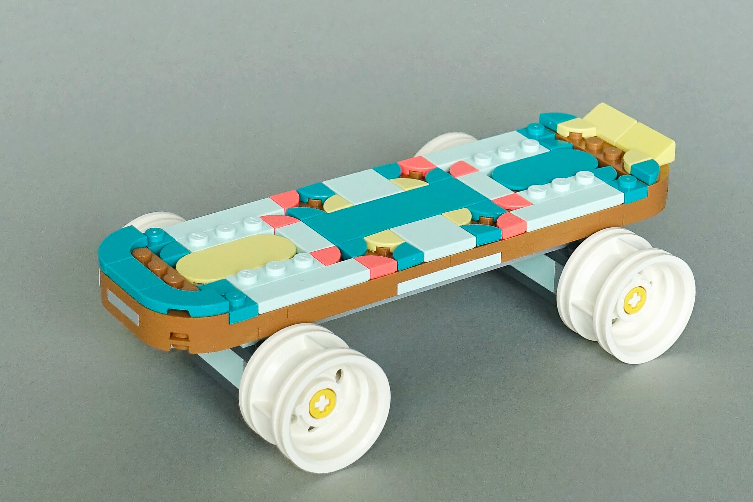 Posledním a zároveň nejjednodušším modelem je skateboard. Přiznám se, že tento model se mi vůbec nelíbí a jeho stavba je absolutně nezajímavá. Začnete stavbou desky, a potom na ní sestavujete ornament převážně z malých dílků. Této části je vyhrazena téměř polovina návodu. Když se přes toto prokoušete, tak desku otočíte, přidáte kola a máte hotovo.