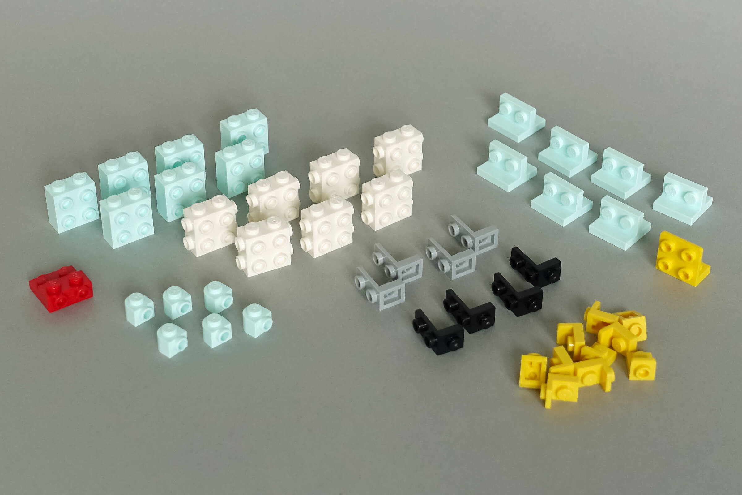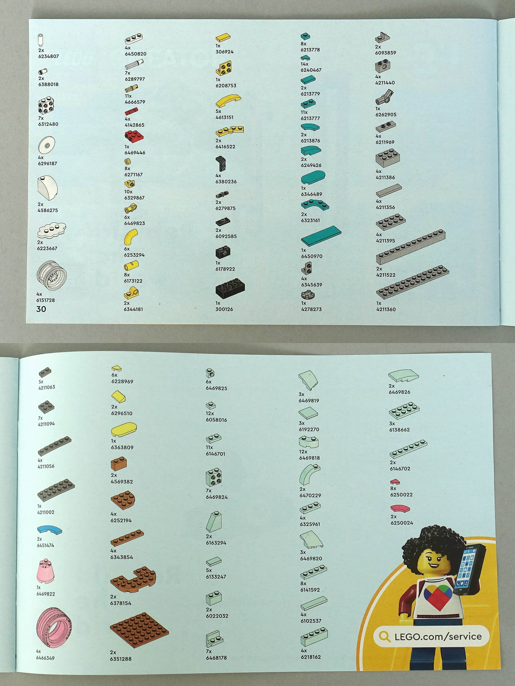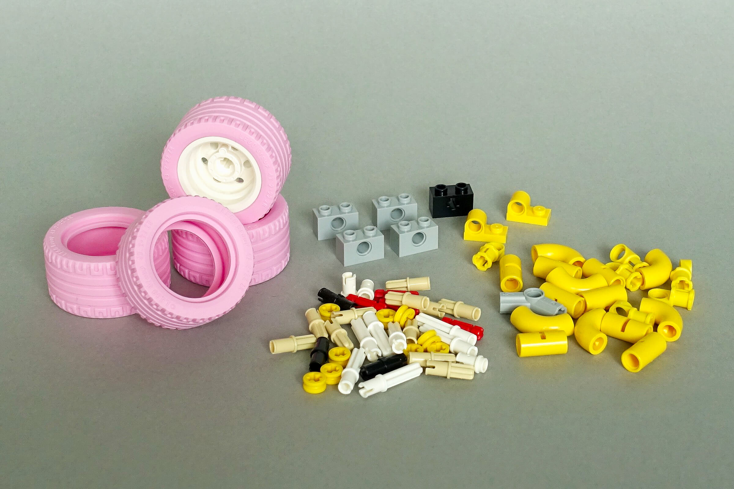Z pohledu kostek tu máme poměrně neobvyklé barvy v čele s pastelovou bledě zelenou a růžovými pneumatikami. Běžně preferuji základní barvy, ale růžové pneumatiky mě zaujaly na první dobrou. Dále stavebnice obsahuje slušné množství kostek Technic a kostek s čudlíky do stran.