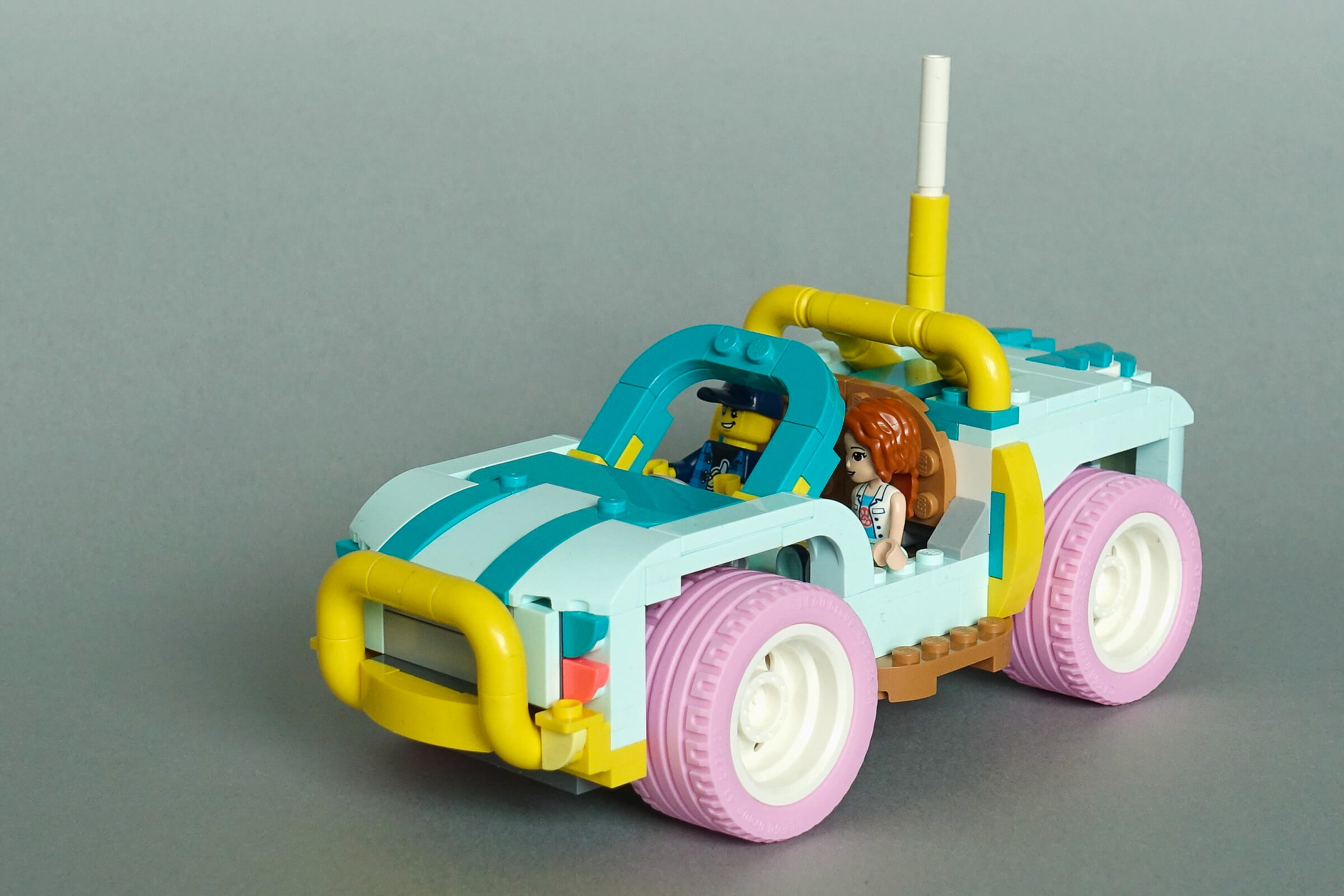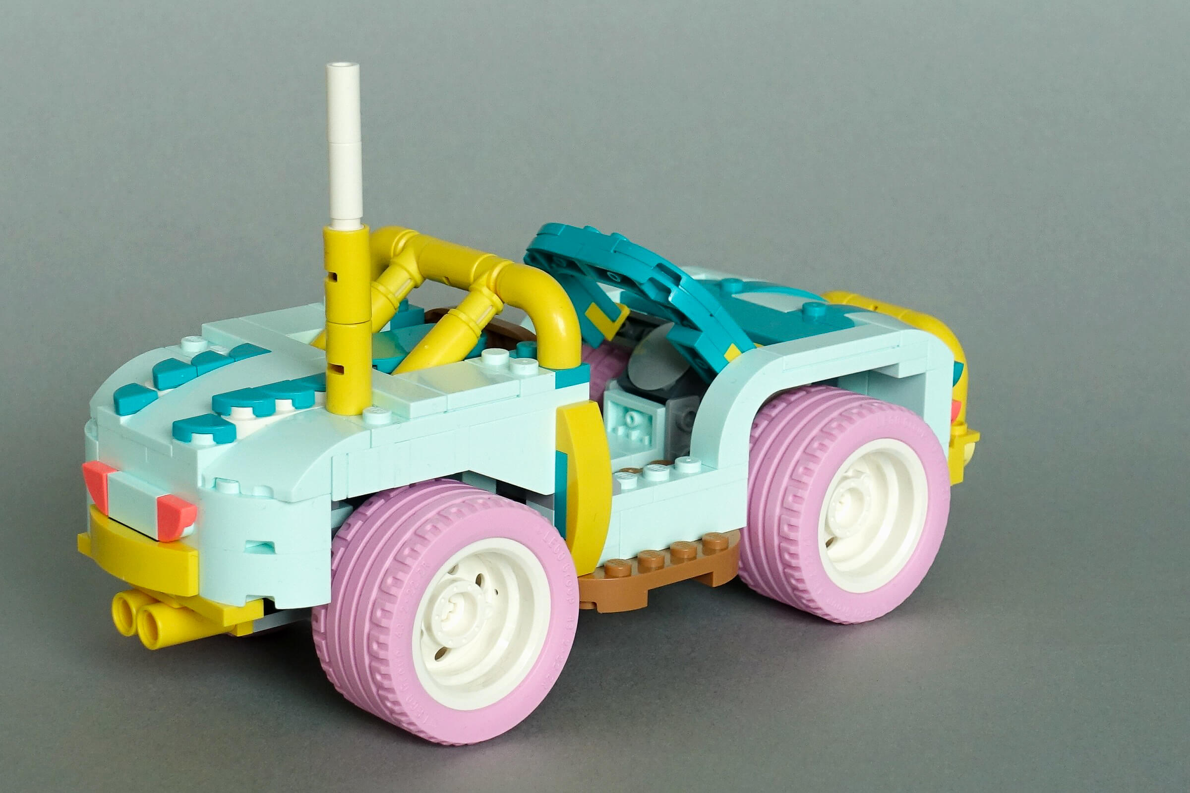 A dá se z těchto kostek postavit i něco jiného než předešlé tři modely? První, co mě napadlo, byla stavba auta. Jsou tu ty čtyři růžová kola a Technic kostky by se daly použít na trubkový rám místo nárazníku – mohl by to tedy být nějaký tréňák. Kola určují velikost výsledného auta, a protože jsou poměrně velká, začal jsem hledat místa, kde by se daly ušetřit nějaké kostky, abych byl schopný model vůbec dokončit. Rozhodl jsem se obětovat střechu a dveře. Nakonec mi z toho vyšel parádní terénní kabriolet pro panenky. Ke stavbě jsem použil rovných 300 kostek. Kabriolet má vpředu masivní trubkový rám kolem nárazníku, další trubkový rám za sedadly, dostatek místa pro dvě figurky a snadno odnímatelnou anténu dálkového ovládání (líbila se mi totiž myšlenka autíčka na vysílačku, i když na tu už kostky nezbyly). Návod bude brzy k dispozici na webu www.buildinst.cz