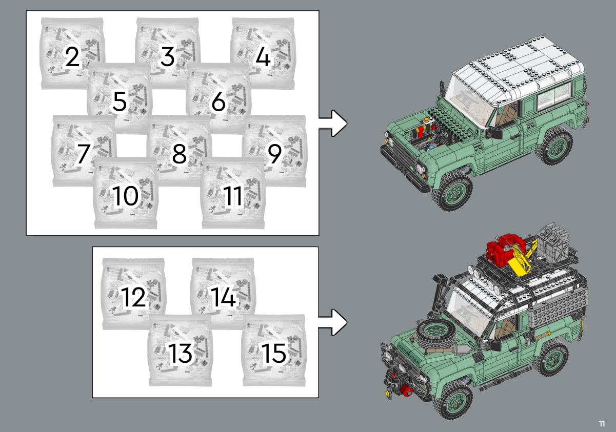 Manuál na stavbu Defenderu by svou délkou strčil do kapsy kdejakou knihu. Má totiž přes 300 stran! Hned na úvod nás seznámí s bohatou historií vývoje modelu, která trvá již 75 let. Už tradičně musím ocenit šedé pozadí manuálu, které je pro mnohé lépe čitelné. Dobrou zprávou je, že od černého pozadí LEGO v budoucnu úplně ustoupí. V průběhu stavby narazíte na zajímavá fakta o vozidle a použitých dílcích.