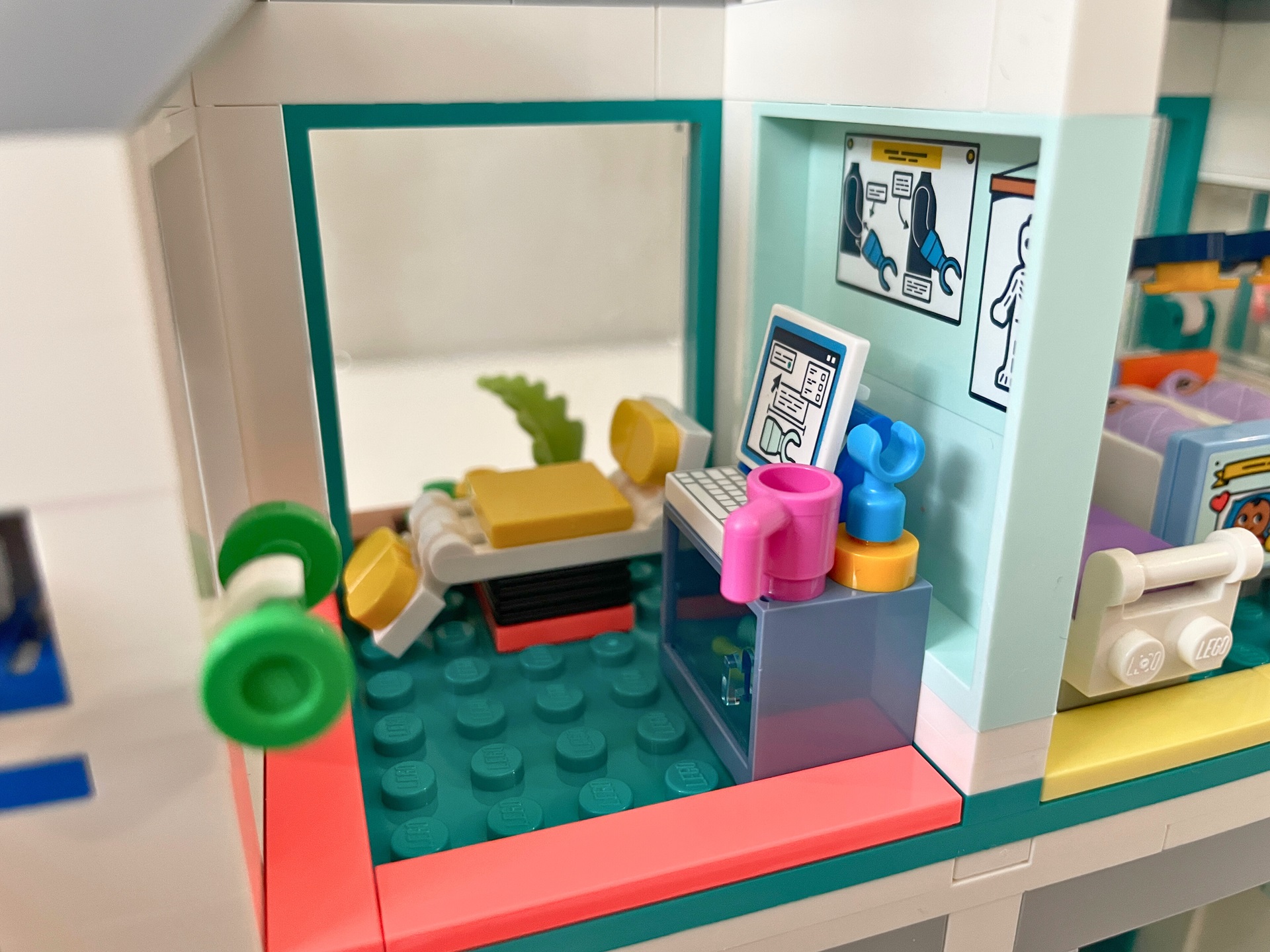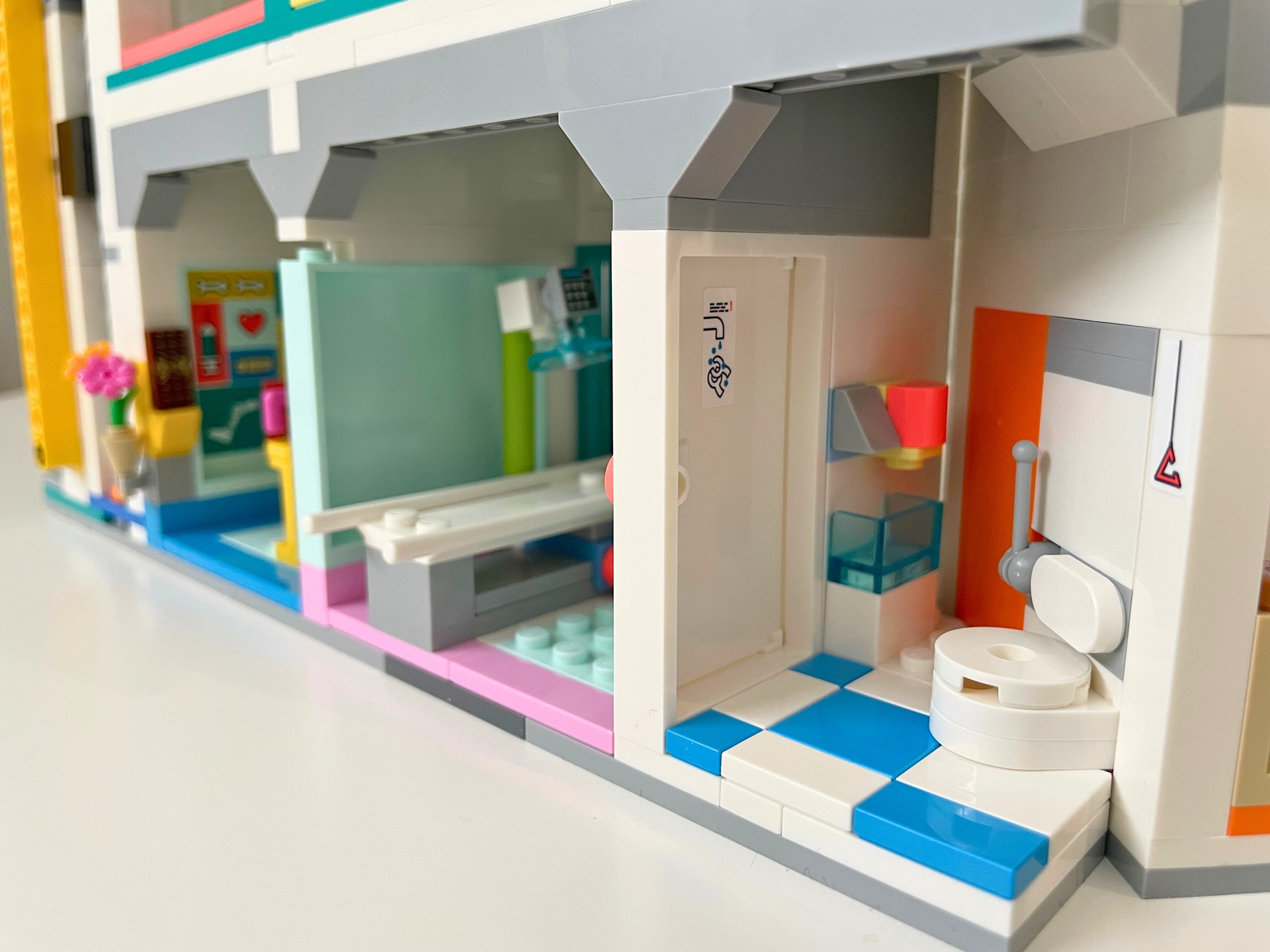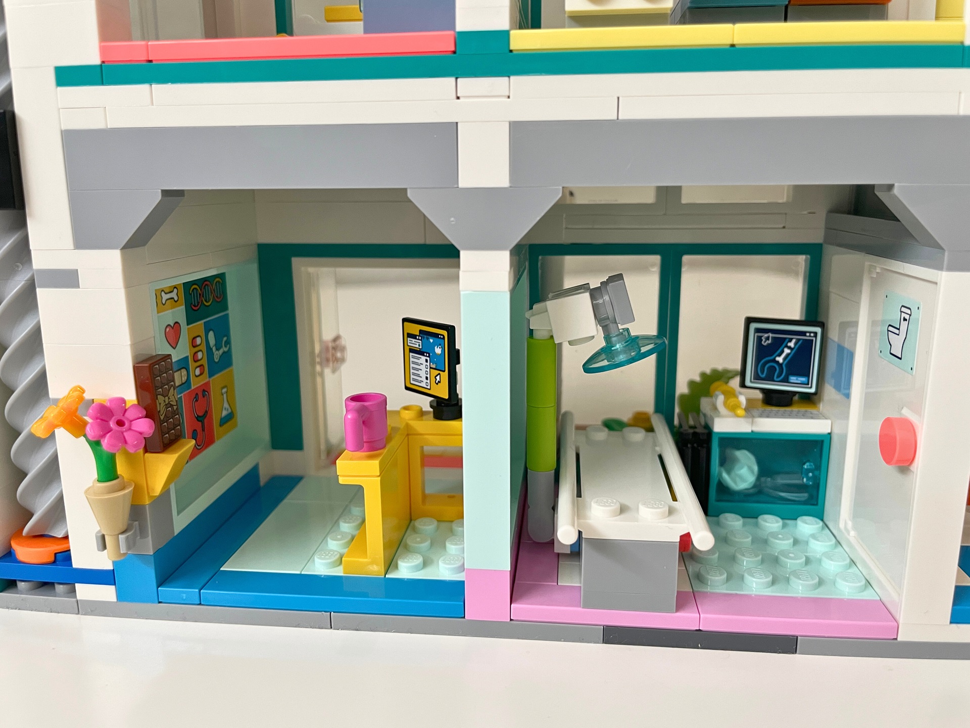 Téma nemocnice je mi osobně blízké a v LEGO světě ho vidím rovněž rád, ale ze setu 42621 Nemocnice v městečku Heartlake mám trochu rozporuplné pocity. Některé jeho části jsou naprosto skvělé (protetika, výtah) a jiné bych klidně zcela vynechal, nebo minimálně upravil (vrtulník, pokoj pro matku a děti, květiny). Kdo nemá rád samolepky, bude při stavbě trpět. Jak už je v řadě Friends zvykem, právě díky jejich velkému počtu je interiér detailnější.