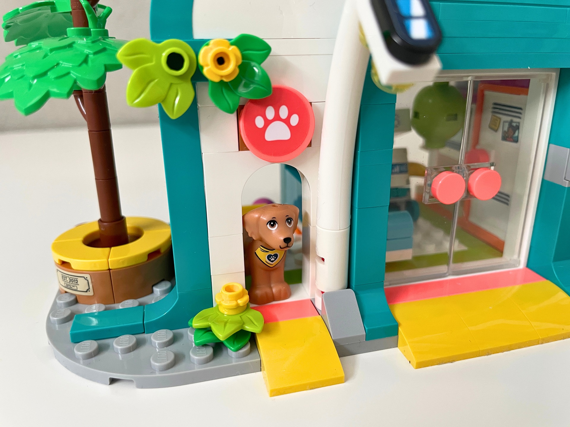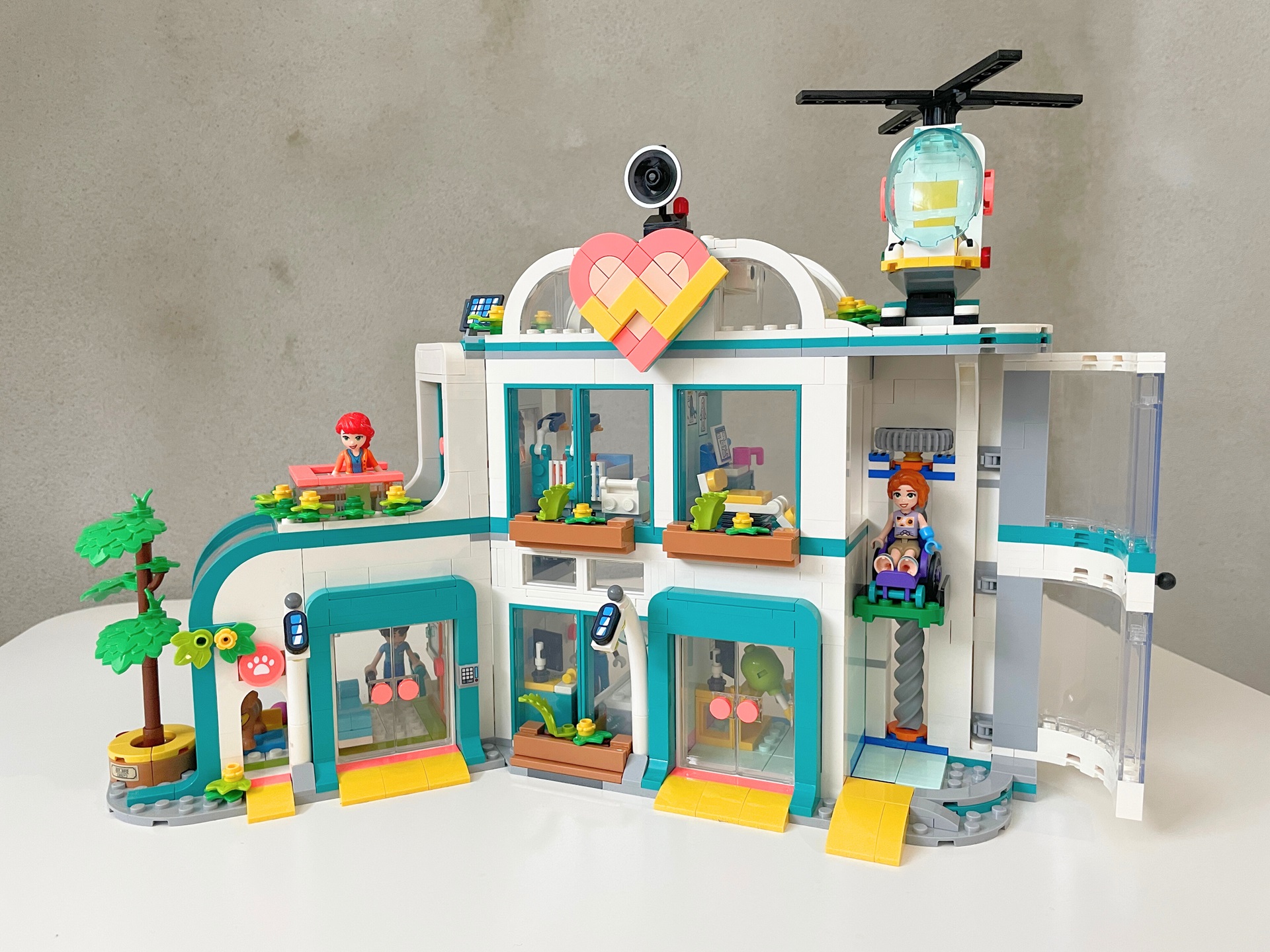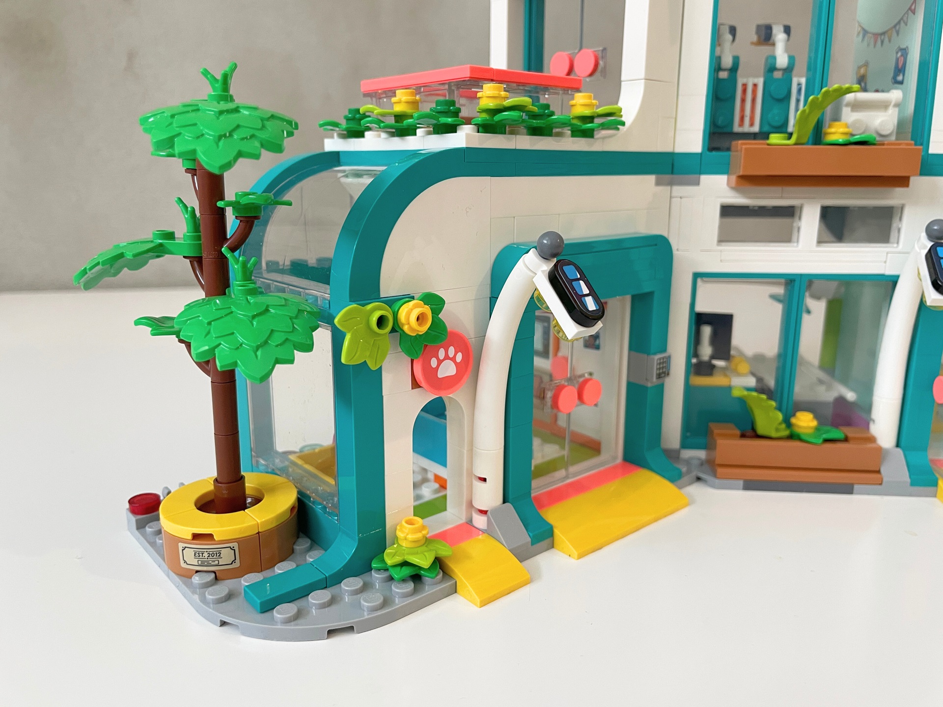Po tomhle krátkém úvodním stavění konečně přijde na řadu hlavní budova. Jako první se staví menší levé křídlo nemocnice. Přízemí nabízí hned dva vchody, jeden pro zaměstnance nemocnice a druhý pro canisterapeutického psa. Oba vedou do odpočinkové místnosti. Ta nabízí posezení, malou kuchyňku, šatní skříň a pelech pro psa. Musím se přiznat, že mi nejdříve přítomnost psa v nemocnici nedávala smysl, ale když jsem celou stavebnici dostavěl a zjistil, jaká další oddělení se v ní nachází, vše do sebe zaklaplo. Shodou okolností jsem hned následující den v práci (pracuji v nemocnici) potkal našeho čtyřnohého terapeuta. Na střeše této části budovy už se nachází jen terasa s posezením. U budovy stojí květináč se stromem. Plaketa oznamující založení v roce 2012 odkazuje na letopočet, kdy byla odhalena řada Friends.