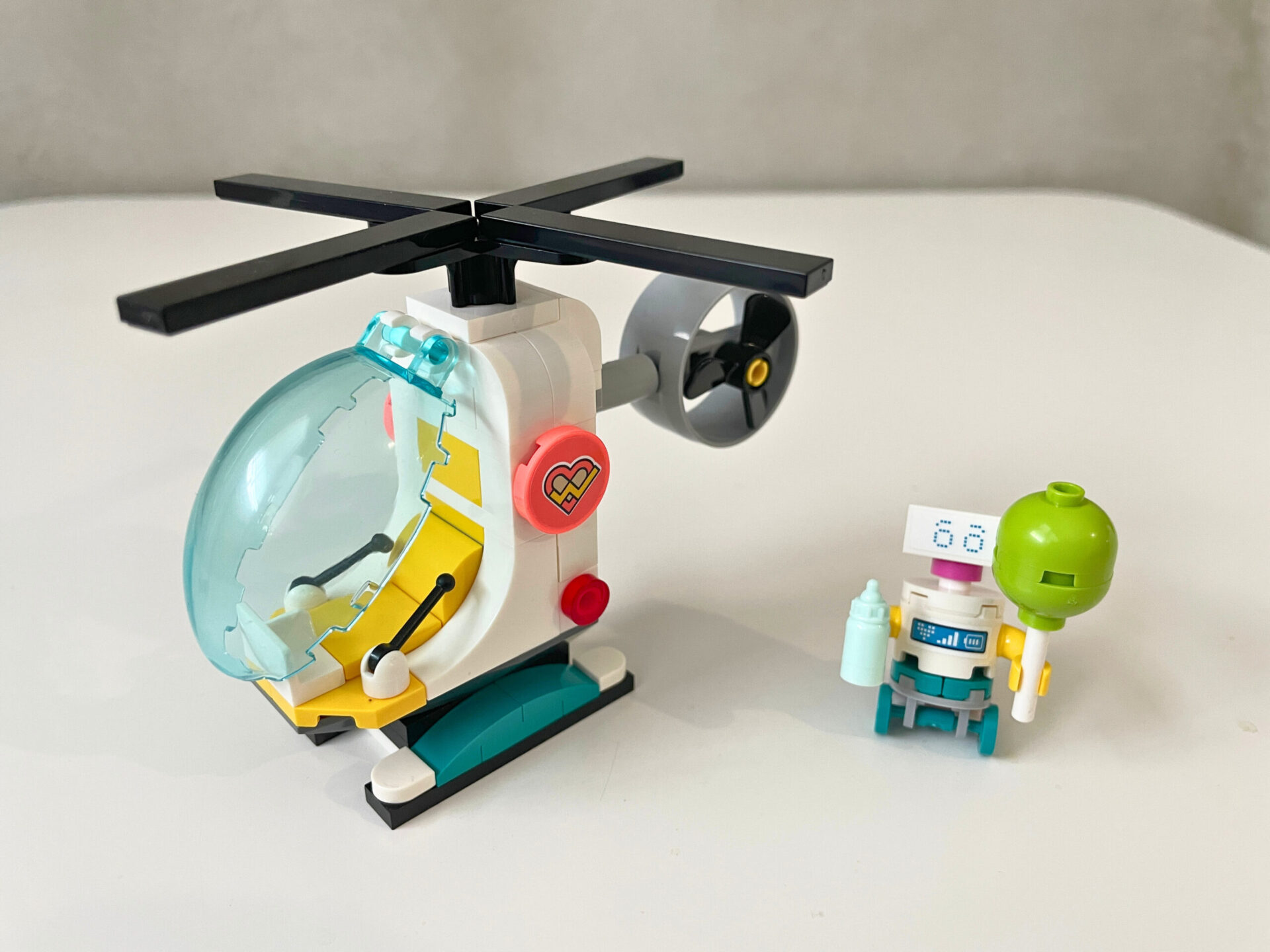 Celá stavba začíná vrtulníkem a malým robotickým pomocníkem. Nečekejte žádnou leteckou přepravu pacientů, tenhle vrtulník uveze jen jednoho pasažéra a maličkatý náklad v podobě zdravotnického materiálu a léků. Představuji si, že slouží spíš k rychlému doručení léků do odlehlých oblastí. Vrtulník se nápadně podobá tomu, který byl obsažen již v nemocnici z roku 2017. Díl sloužící jako přední sklo je dokonce úplně totožný. Stroj má samozřejmě své místo na střeše budovy, kde je pro něj přichystána plocha s typickým H. Vrtulník je bohužel neuvěřitelně křehký, prakticky při jakémkoliv pokusu o hru mi nějaká jeho část odpadla. Týká se to hlavně listů rotoru, ale ani přistávací ližiny pořádně nedrží. Mnohem raději bych v balení viděl vůz záchranné služby, který je, dle mého názoru, dětem bližší a také rozšíří herní možnosti. LEGO se však rozhodlo vydat sanitku jako samostatný set. Úvodní pytlík kostek nabídne ještě malého robůtka, jehož smysl úplně nechápu. Opět si mohu jen domýšlet, že v nemocnici slouží jako virtuální asistent a pomocník při donášce nejrůznějších věcí. Balónek v jeho ruce napovídá, že se věnuje především dětem.