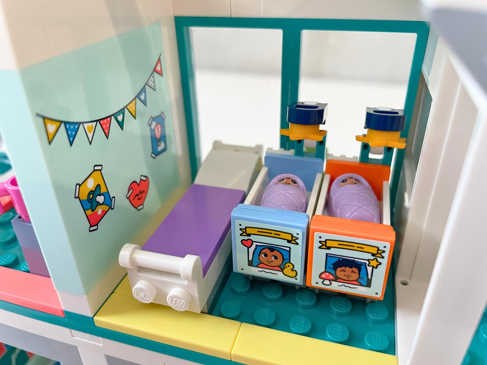Vedlejší pokoj je extrémně stísněný. Na malém prostoru se nachází postel pro matku a dvě lůžka pro novorozence. Víc už se toho nevešlo. Celé horní patro je pěkně prosvětlené díky vysokým stropům a prosklené střeše. Tyto prvky zároveň poskytují větší manipulační prostor pro ruce toho, kdo si se stavebnicí bude hrát. I těch pár centimetrů na výšku dělá velký rozdíl, zvlášť v porovnání s přízemím. Střecha už toho moc nenabídne, pouze heliport, dva malé solární panely, aby se neřeklo, že nemocnice není dostatečně „eko“ a komunikační satelit. Vlastně bych málem zapomněl na docela povedené logo zdravotnického zařízení. Tvoří jej symbol srdce protnutý EKG křivkou.