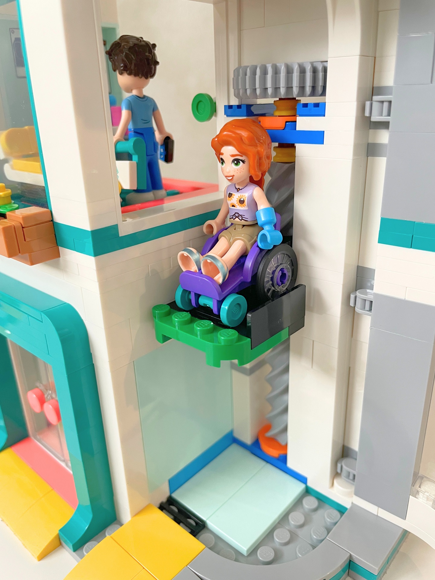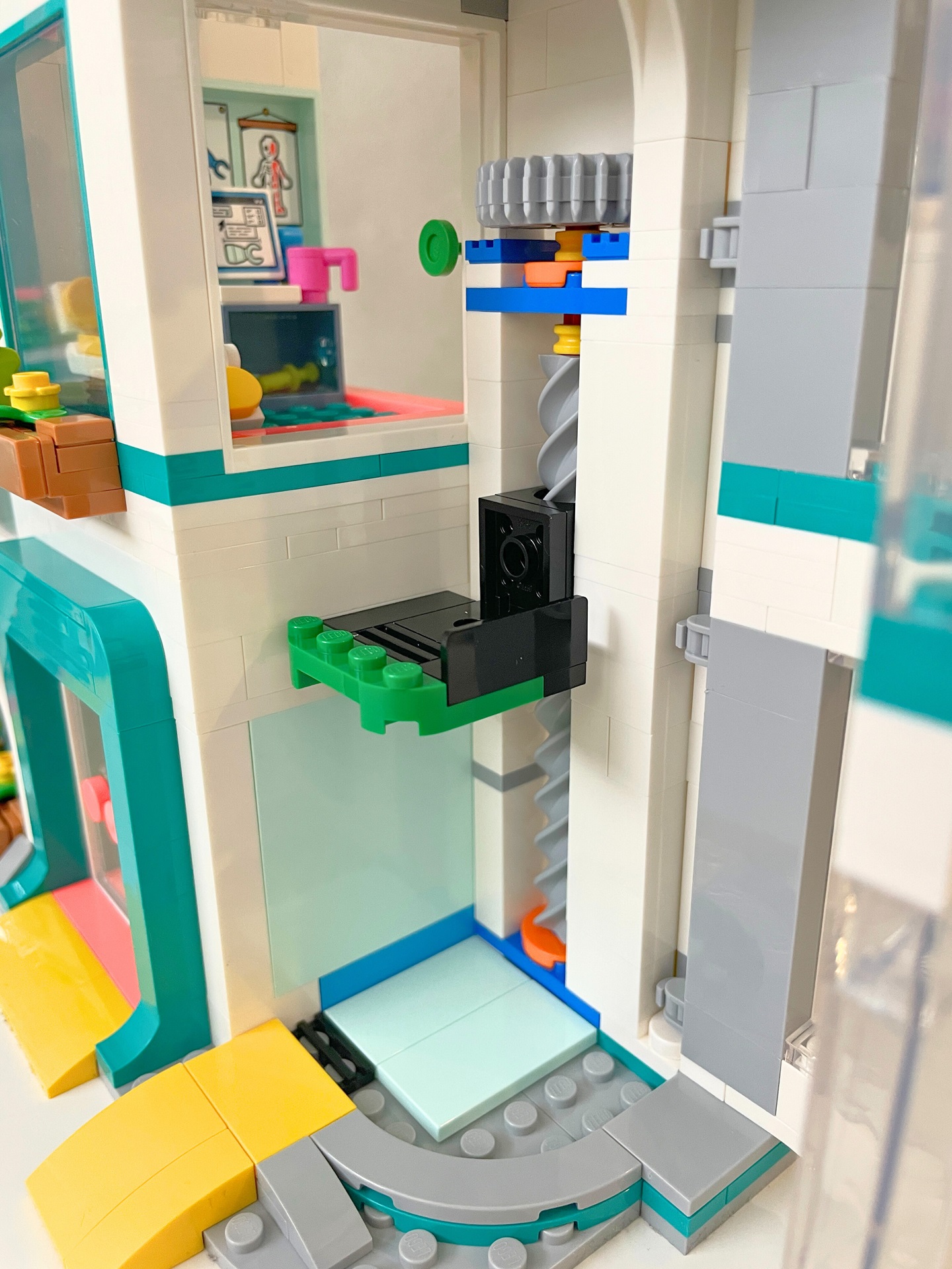 Na závěr jsem si záměrně nechal ten vůbec nejzajímavější prvek celé stavby. Je jím prosklený výtah na pravé straně nemocnice. Vede z úrovně ulice rovnou do ordinace protetické medicíny. Určený je hlavně pro osoby využívající invalidní vozík. Mechanismus zvedání plošiny je ovládán ozubeným kolem na zadní straně nemocnice a využívá poměrně nový dílek šroubovice. Jeho chod je hladký a na pár otočení vyveze pacienty tam, kam potřebují. Díky tomu, že se odklápí celá prosklená fasáda, figurky se do něj velmi snadno nakládají. Je znát, že na osoby s pohybovými problémy bylo myšleno od začátku, protože jsou všechny vstupy vybaveny nájezdovými rampami.