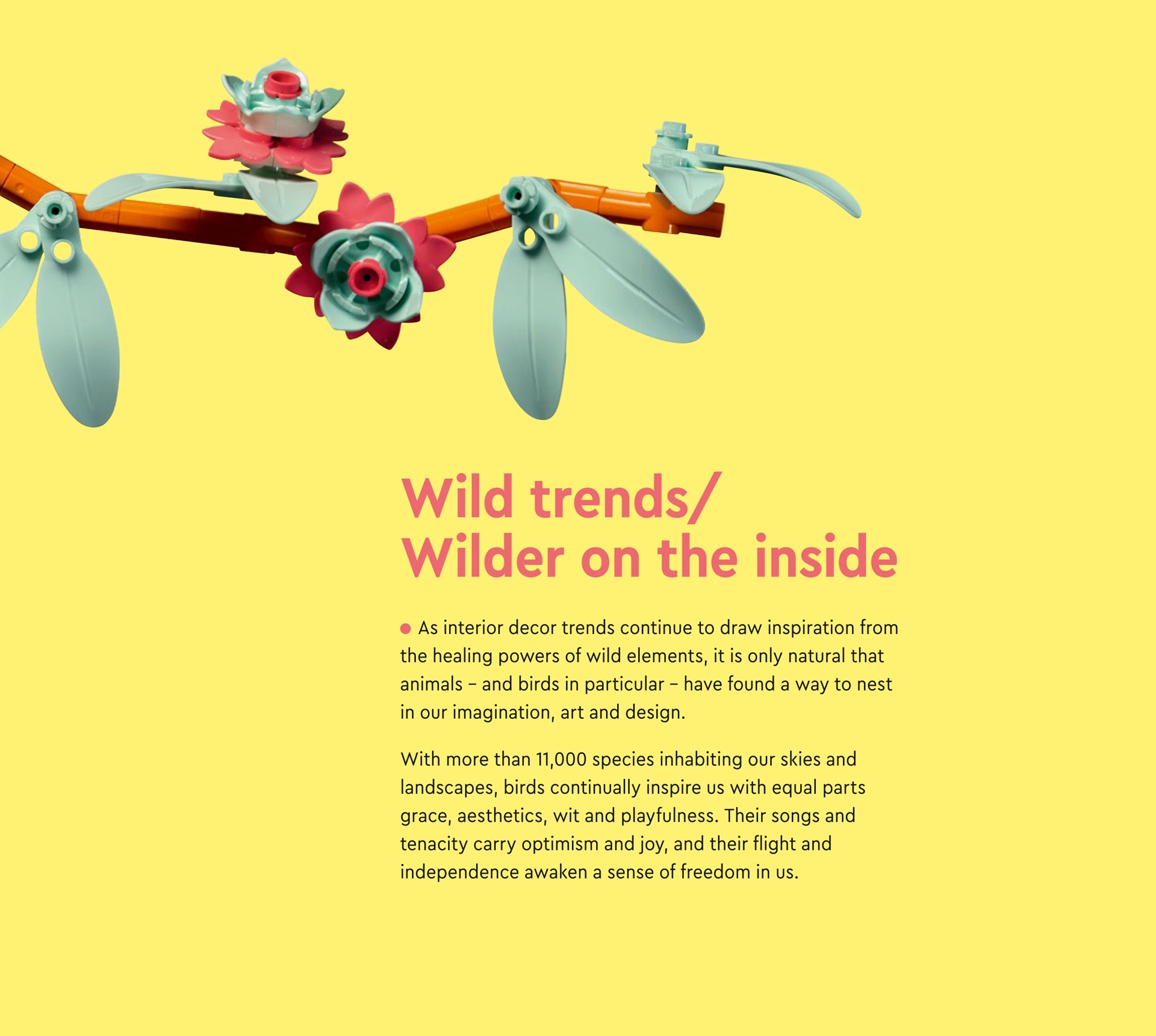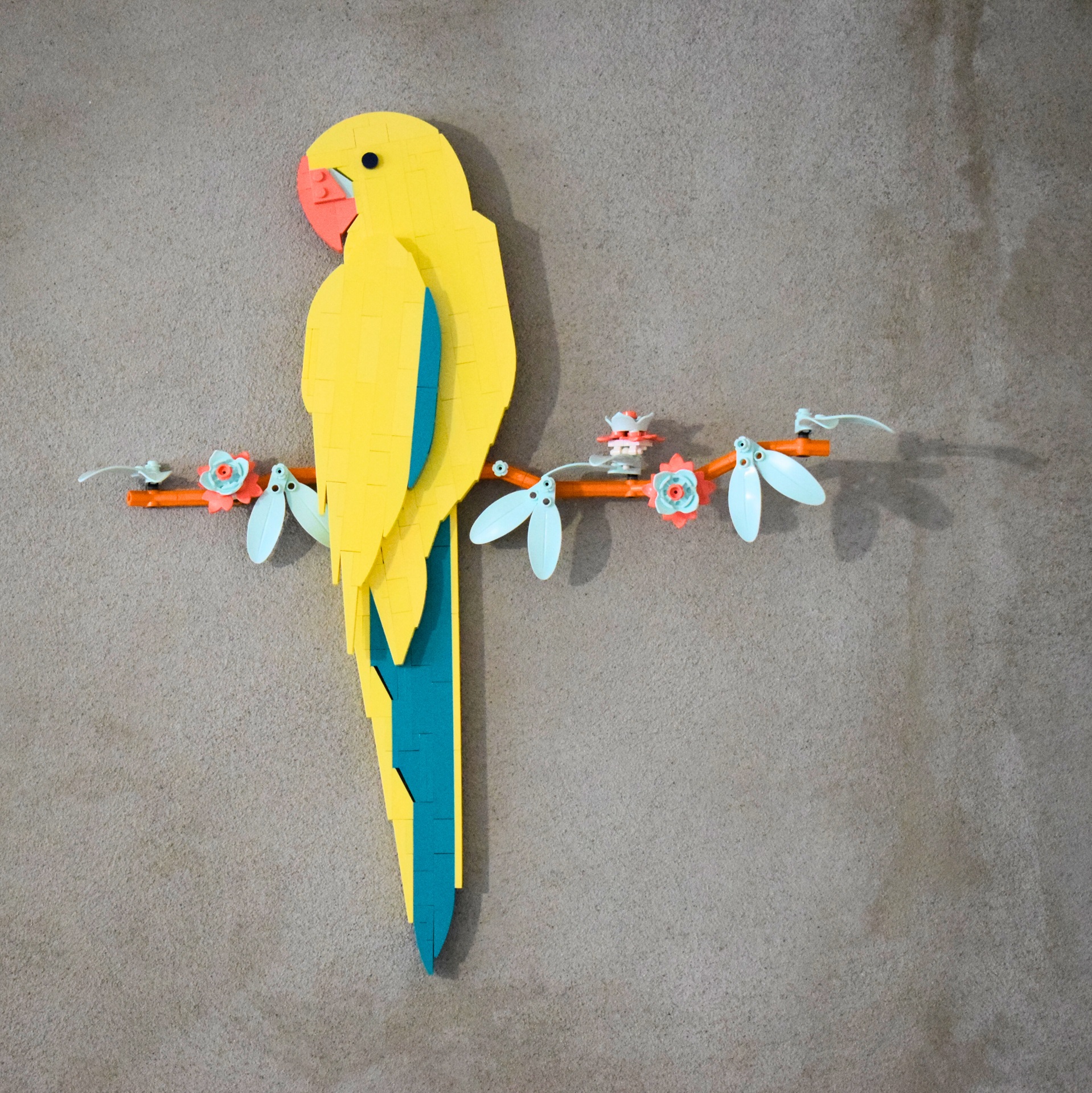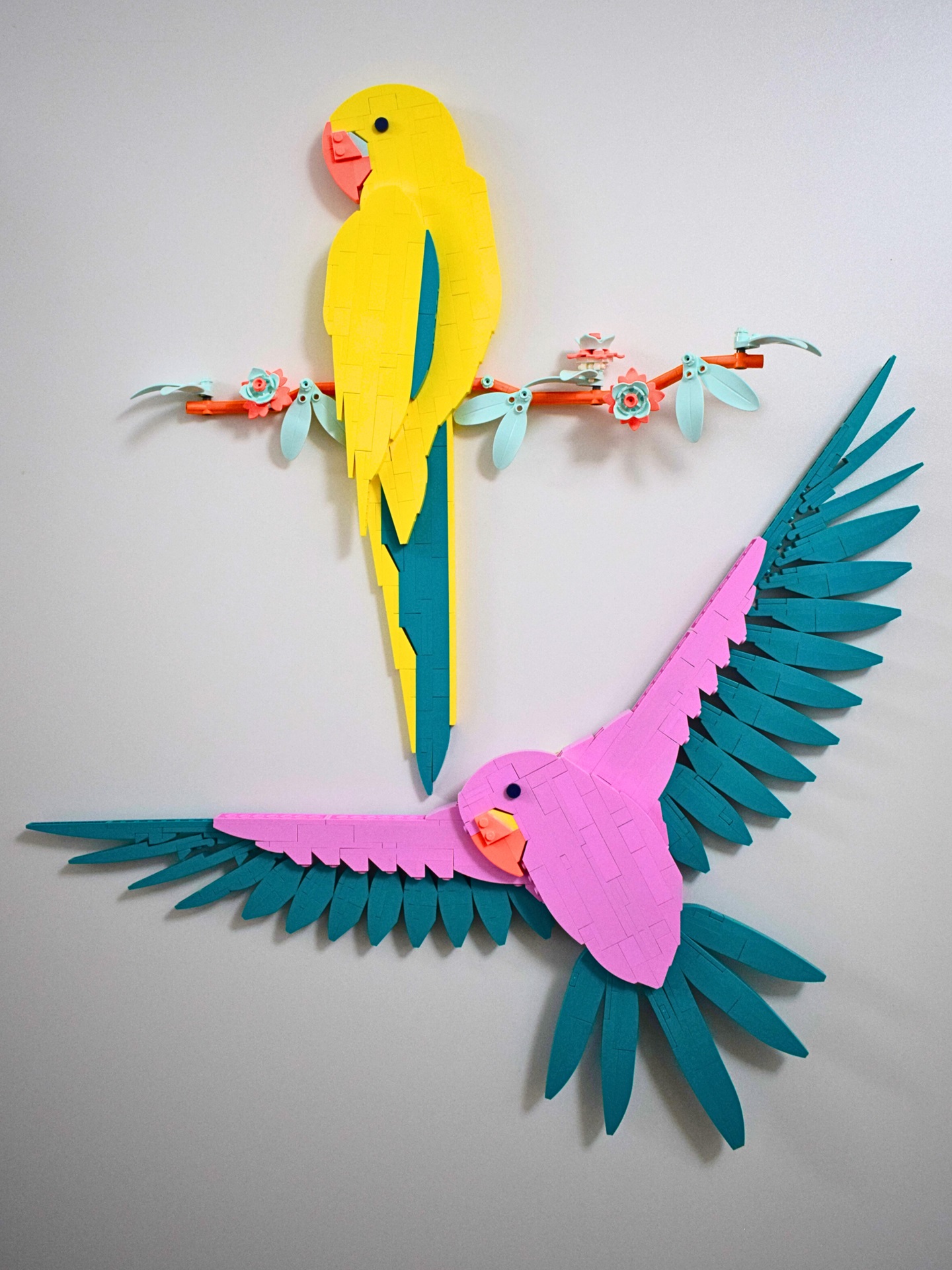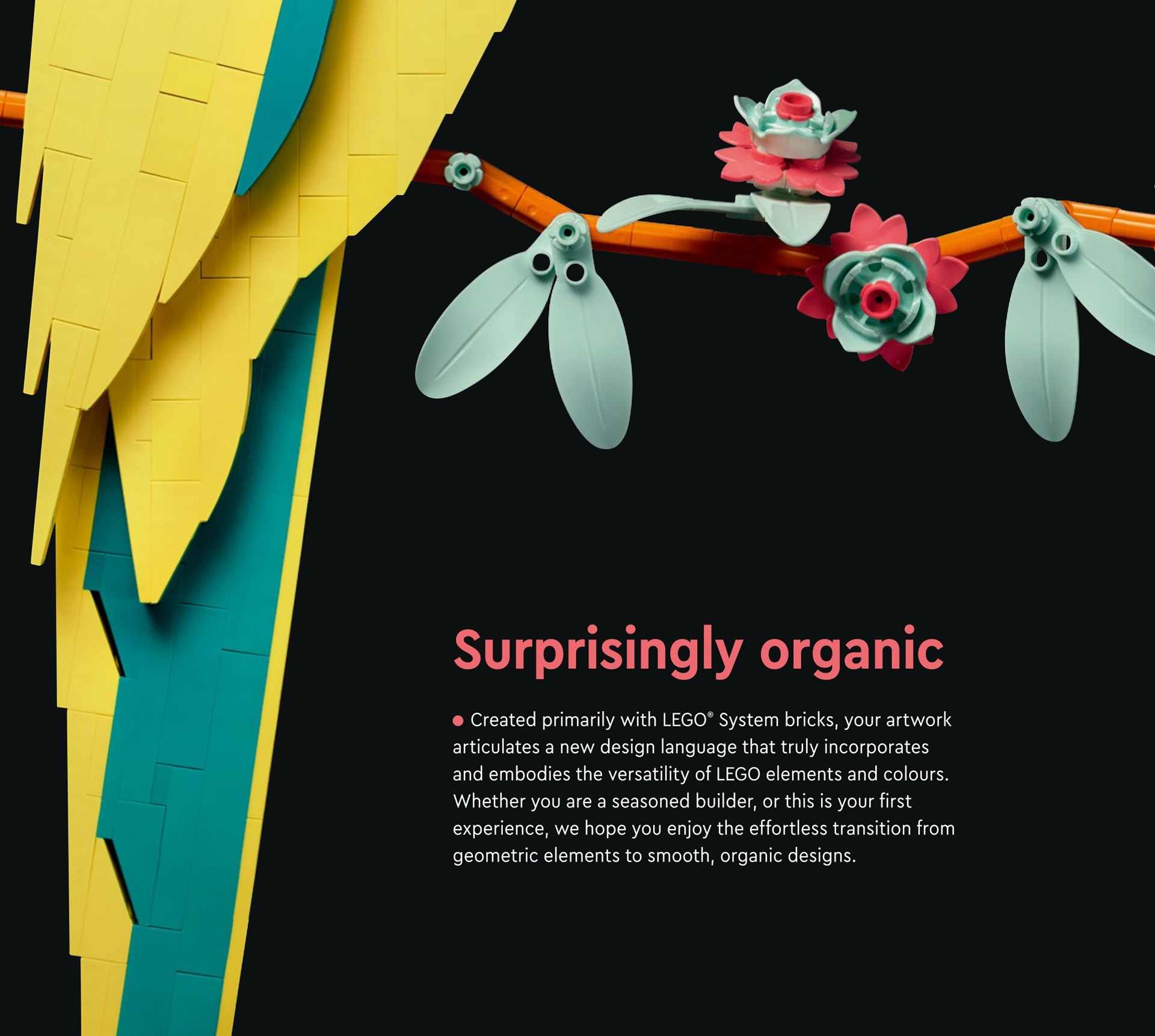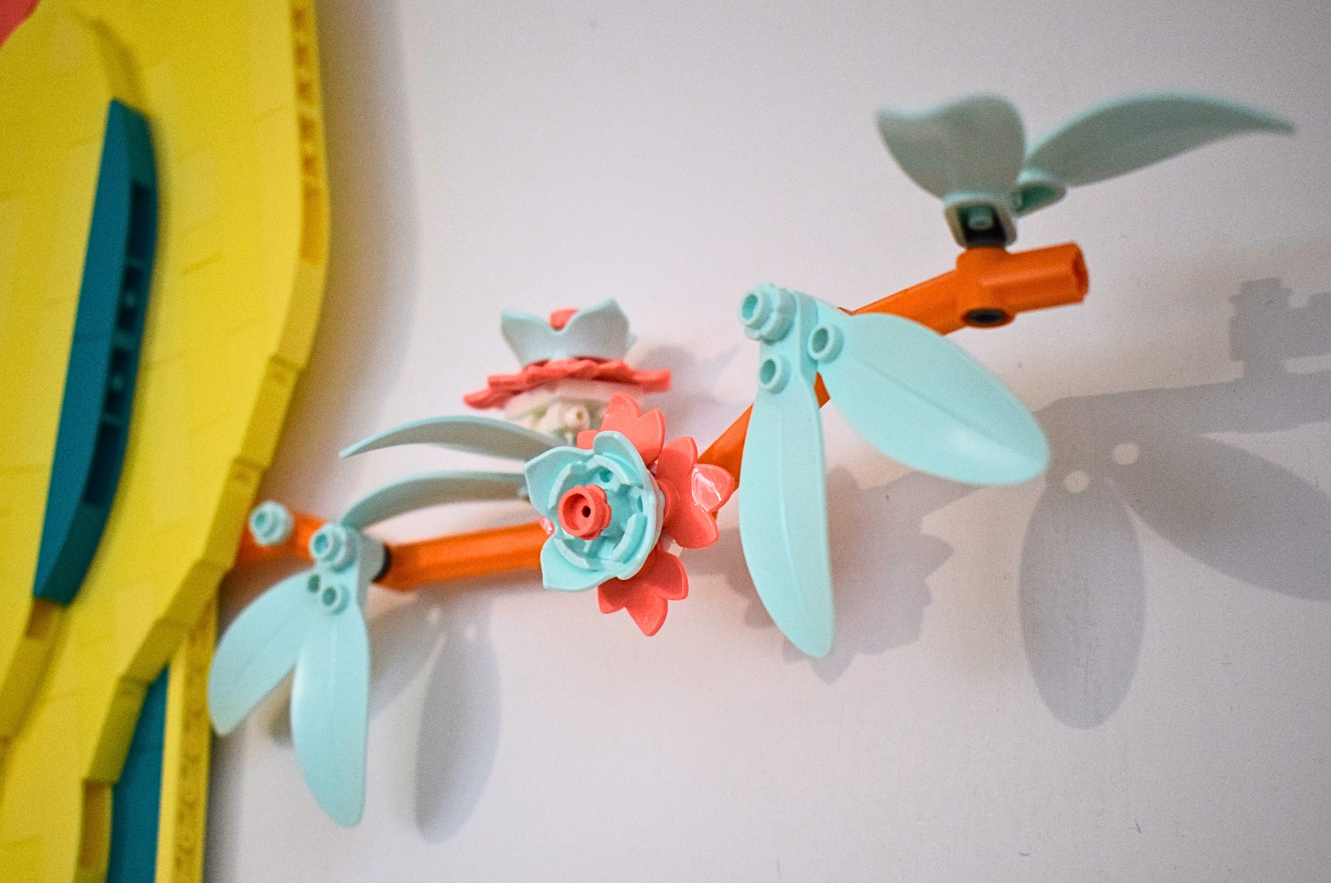 Oba ptáci mají mnoho společného. Jejich těla jsou stavěna na straně a jsou hluboká 3 study – tedy 3 vrstvy kostek. Ani několik stavebních vrstev nezabránilo tomu, aby tvorové nepůsobili velice ploše. Tomuto efektu nepomáhají ani pouhé dvě barvy peří. Žlutý papoušek je zachycen při sezení na větvičce, což je vlastně asi ta vůbec nejzajímavější část stavebnice. Obzvlášť se mi líbí nápadité květy a lehounce namodralé listí. Odstín s názvem „light aqua“ byl na listy použit úplně poprvé. Tato barva je docela neobvyklá a k barevným ptákům dobře sedí.