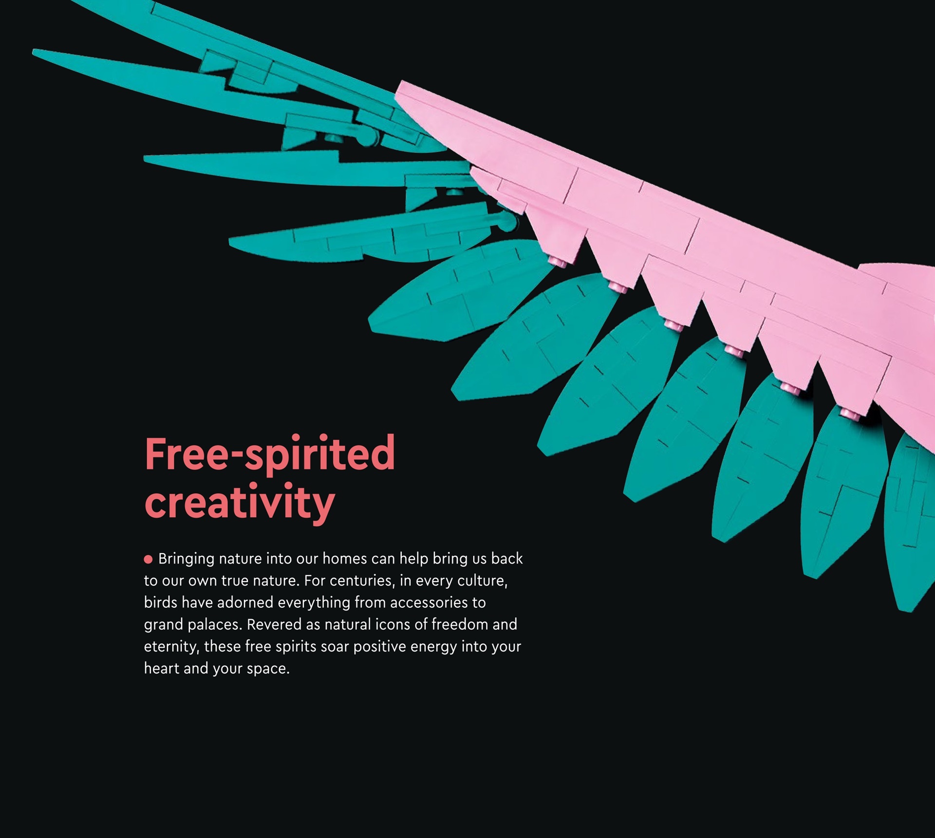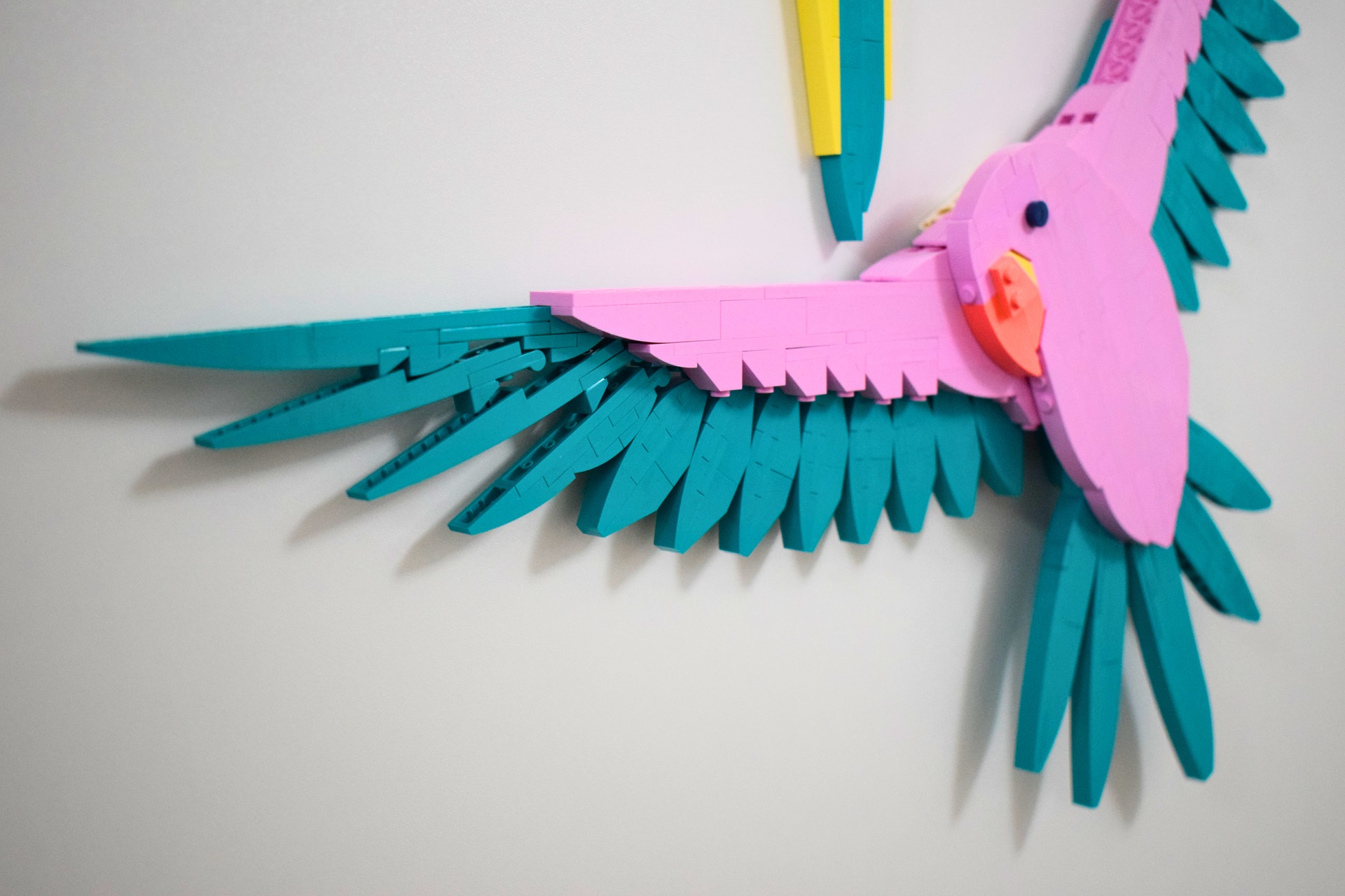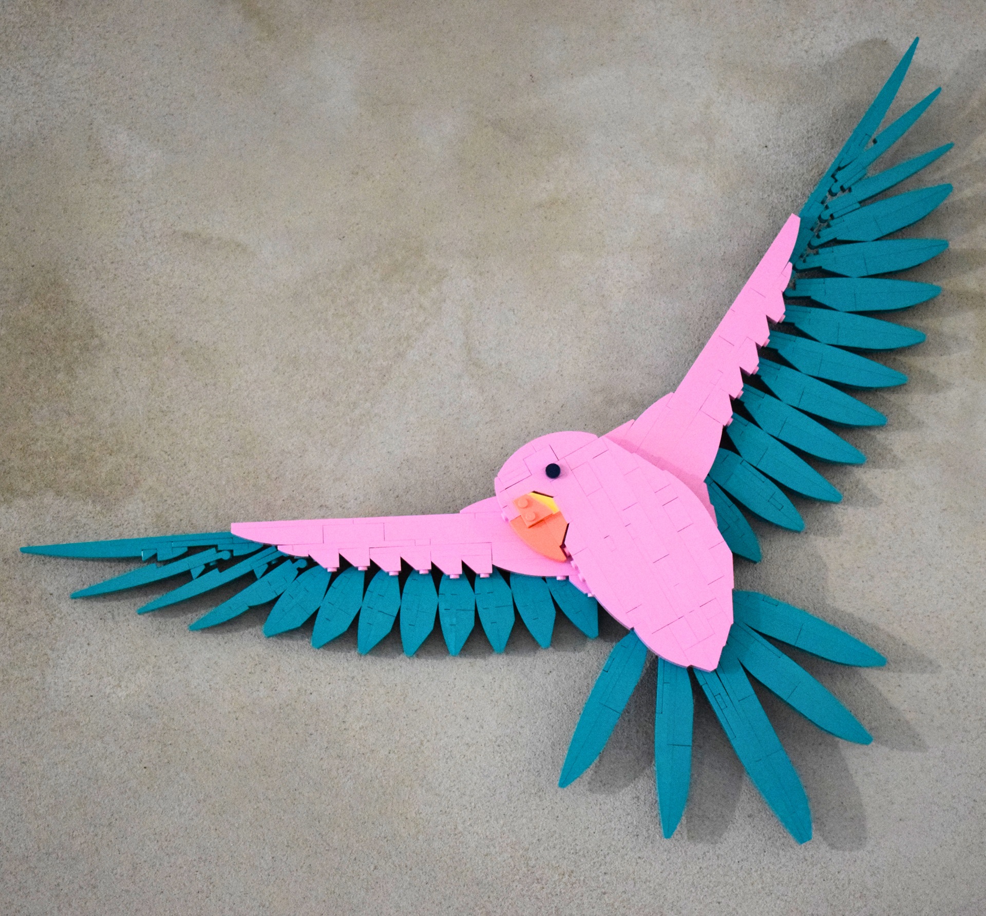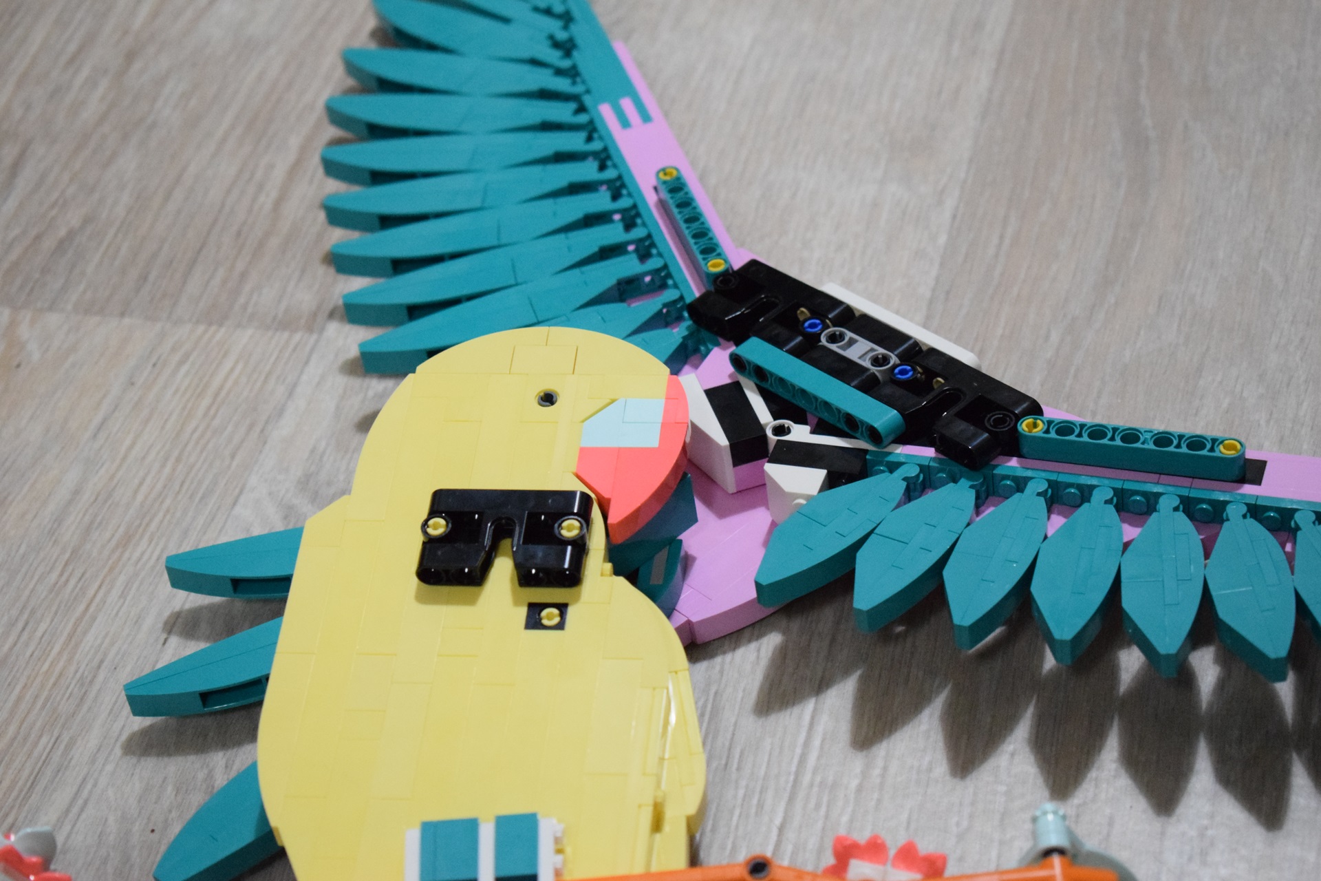 U růžového papouška si autoři vyhrál trochu více. Jeho křídla s rozpětím 55 centimetrů působí monumentálně. A to je vlastně vše. Opět platí, že tělo samotné má hloubku 3 studů, ale v tomto případě je tu navíc ještě jedna vrstva technic dílků zpevňujících křídla. Upevňující struktura drží také ocasní pera. Návrháři stavebnice se pokusili růžového Aru zachytit v letové pozici. Tento záměr chválím, ale bohužel nemohu říct, že provedení považuji za podařené. Možná je za tím absence představivosti v mé hlavě, ale na několik prvních pohledů (a vlastně pořád) mi tělo opeřence přišlo tak nějak divně zdeformované. Situaci nezachrání ani (ne)originalita stavebních technik. Peří na křídlech je tvořeno vždy několika totožnými strukturami, a proto jsem se u stavby trošku nudil.