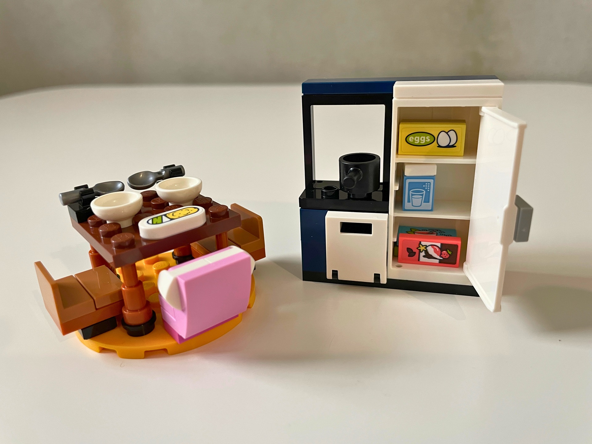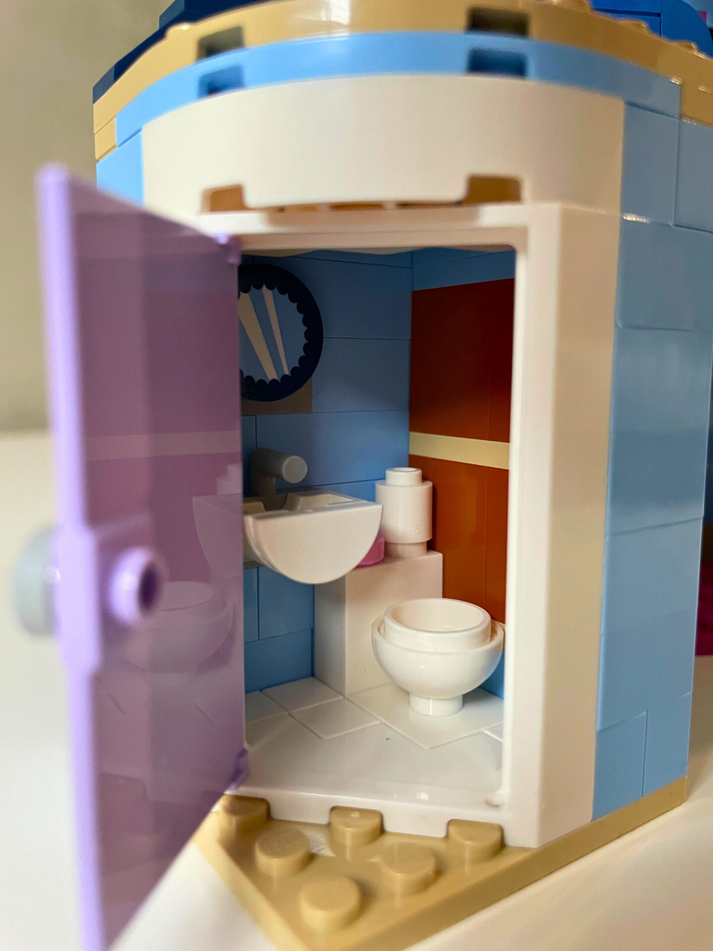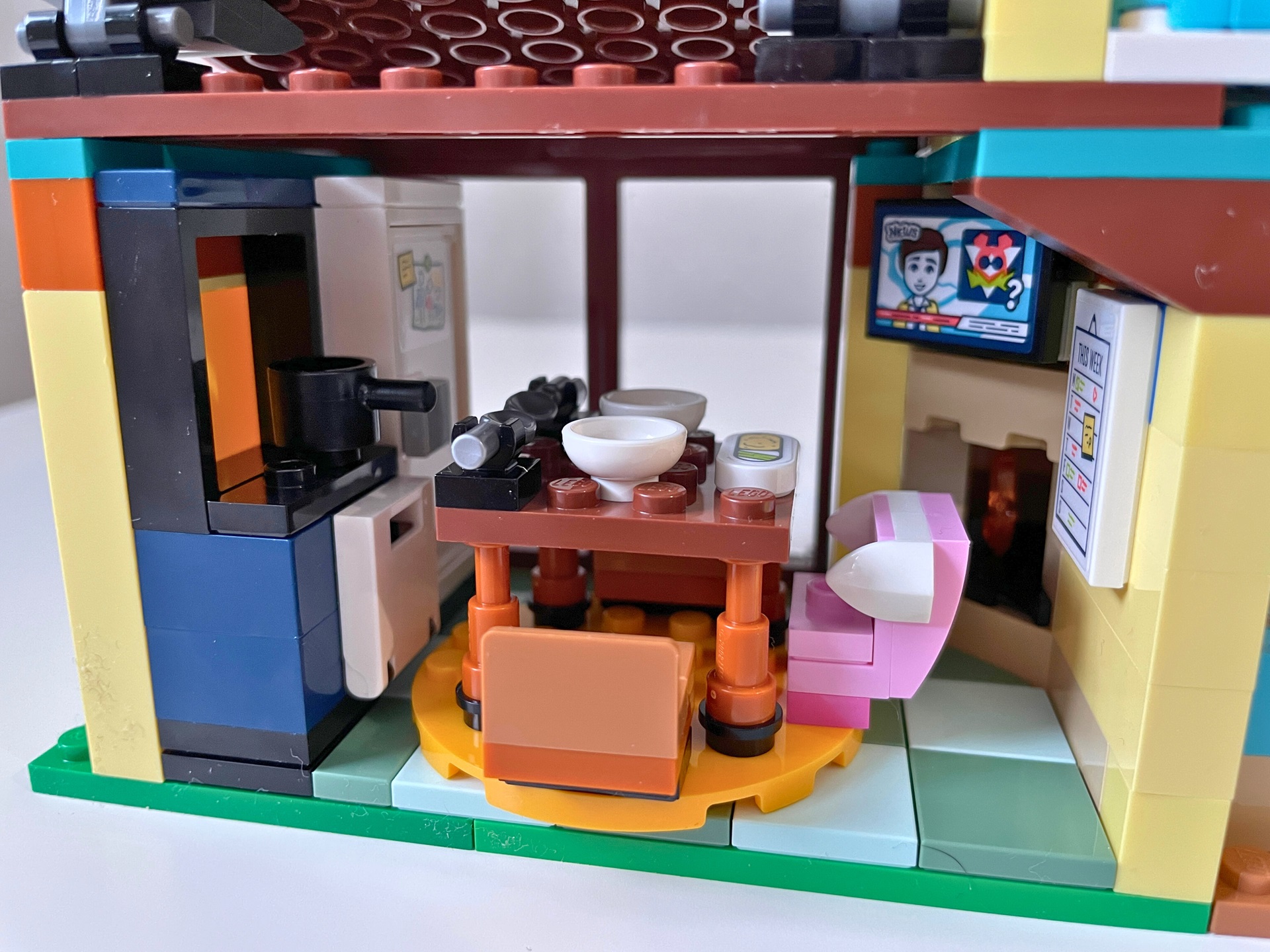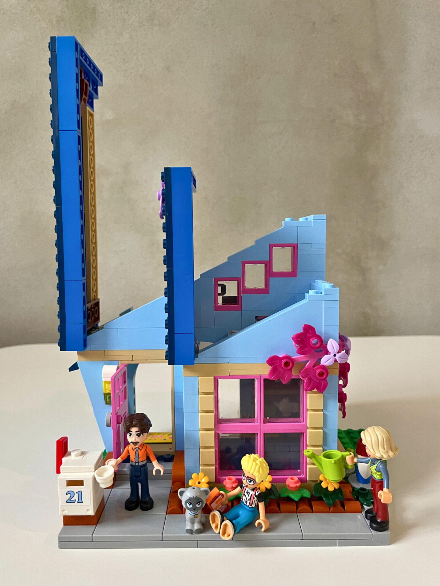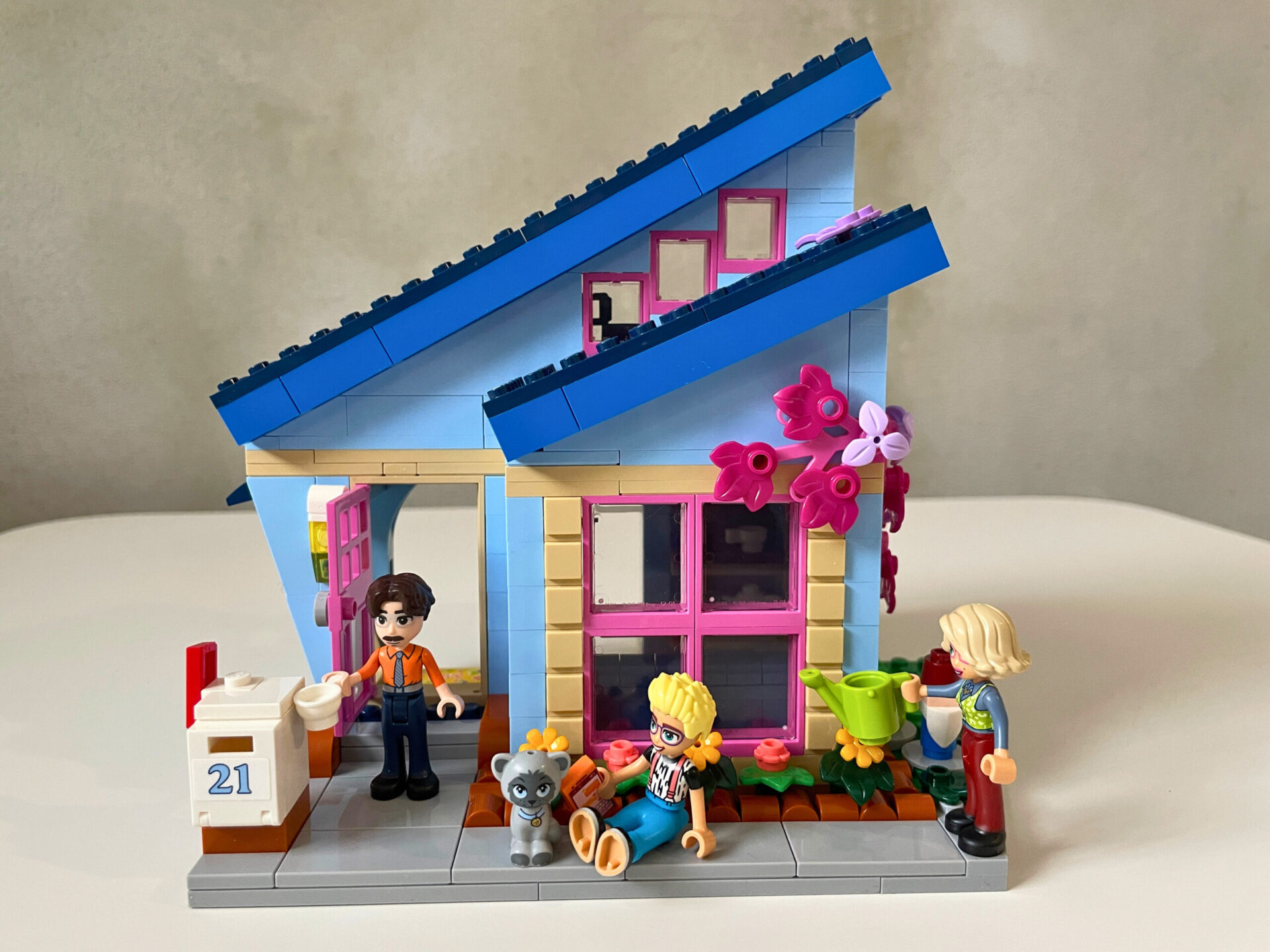 Návod na stavbu je rozdělen do dvou sešitů, každý pro jeden z domů. Do cíle vede 188 srozumitelných kroků. Během stavění jsem nenarazil na žádný zádrhel a vše příjemně utíkalo. Začíná se domem s modrou fasádou, ve kterém žijí rodiče Gwen a Martin se svým synem jménem Olly. Dvoupodlažní domek mnoho prostoru nenabízí. V přízemí je pouze obývací pokoj a toaleta, horní patro zcela obsadil Ollyho pokoj. Protože nebylo místa nazbyt, gauč stojí zády přímo u velkého okna do ulice. To by mě osobně nebylo zrovna příjemné. Pro lepší přístup do spodního patra je místnost s toaletou umístěna na pantech a lze ji od zbytku budovy odklopit.