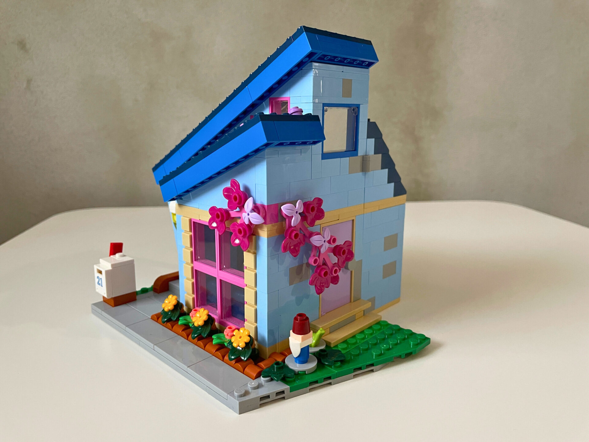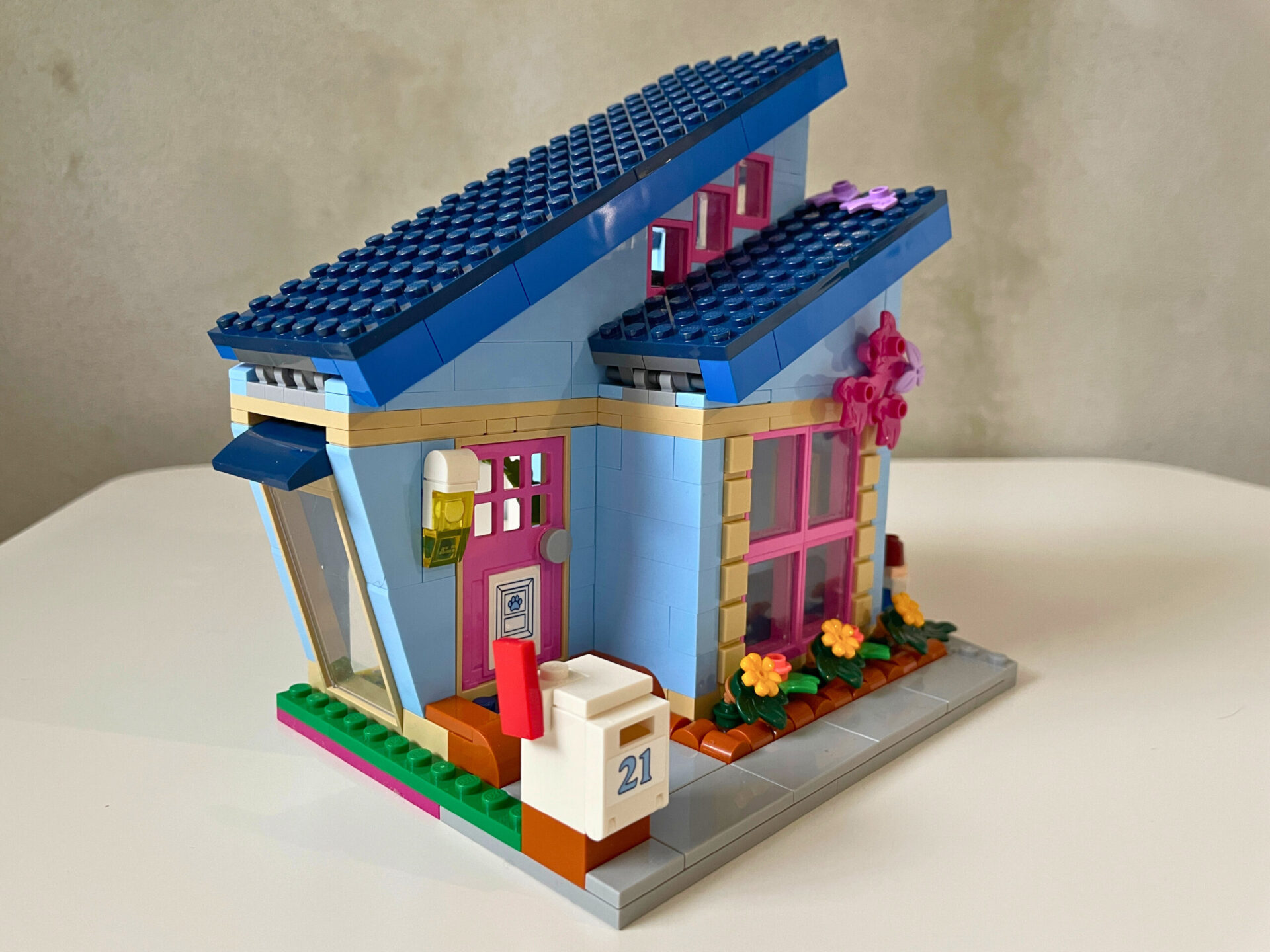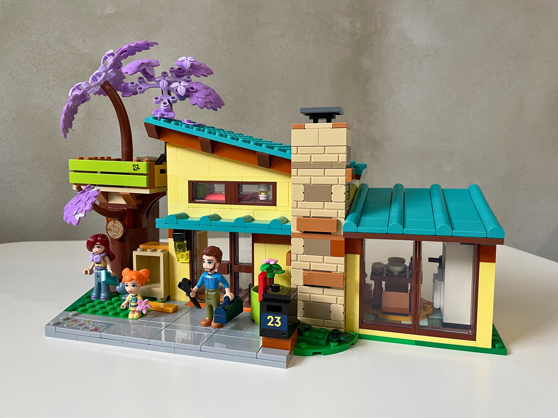 Na pozemku vedle domu stojí ještě jedna stavba – domek na stromě. Dutý kmen nabízí super místo na schovávání, na platformě na jeho vrcholu je pak bedna s vysílačkami a vzpomínkami dětí. Pod stromem stojí ještě bedna sloužící jako obydlí pro veverku. Že patří oba domy vedle sebe dokazují jejich popisná čísla 21 a 23. Vtipným detailem je číslo 22 na stromodomě, který stojí přesně mezi. Navíc lze listí ze stromu najít i na střeše modrého domu. Z architektonického hlediska se mi zdá druhý dům o něco povedenější. Líbí se mi velké okno v přízemí i podlouhlé okno v dětském pokoji. Celou stavbu zdobí hlavně komín obložený kamenem a povedená střecha. Nechybí samozřejmě ani chodník a schránka na dopisy.