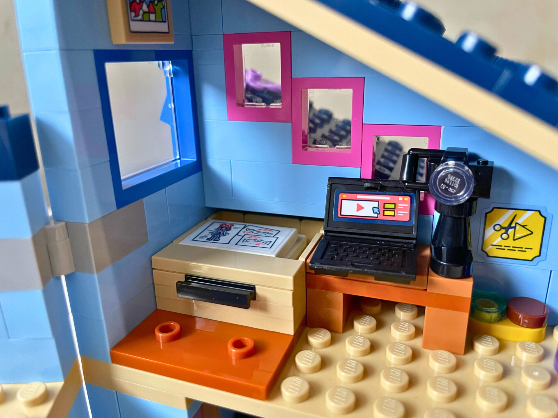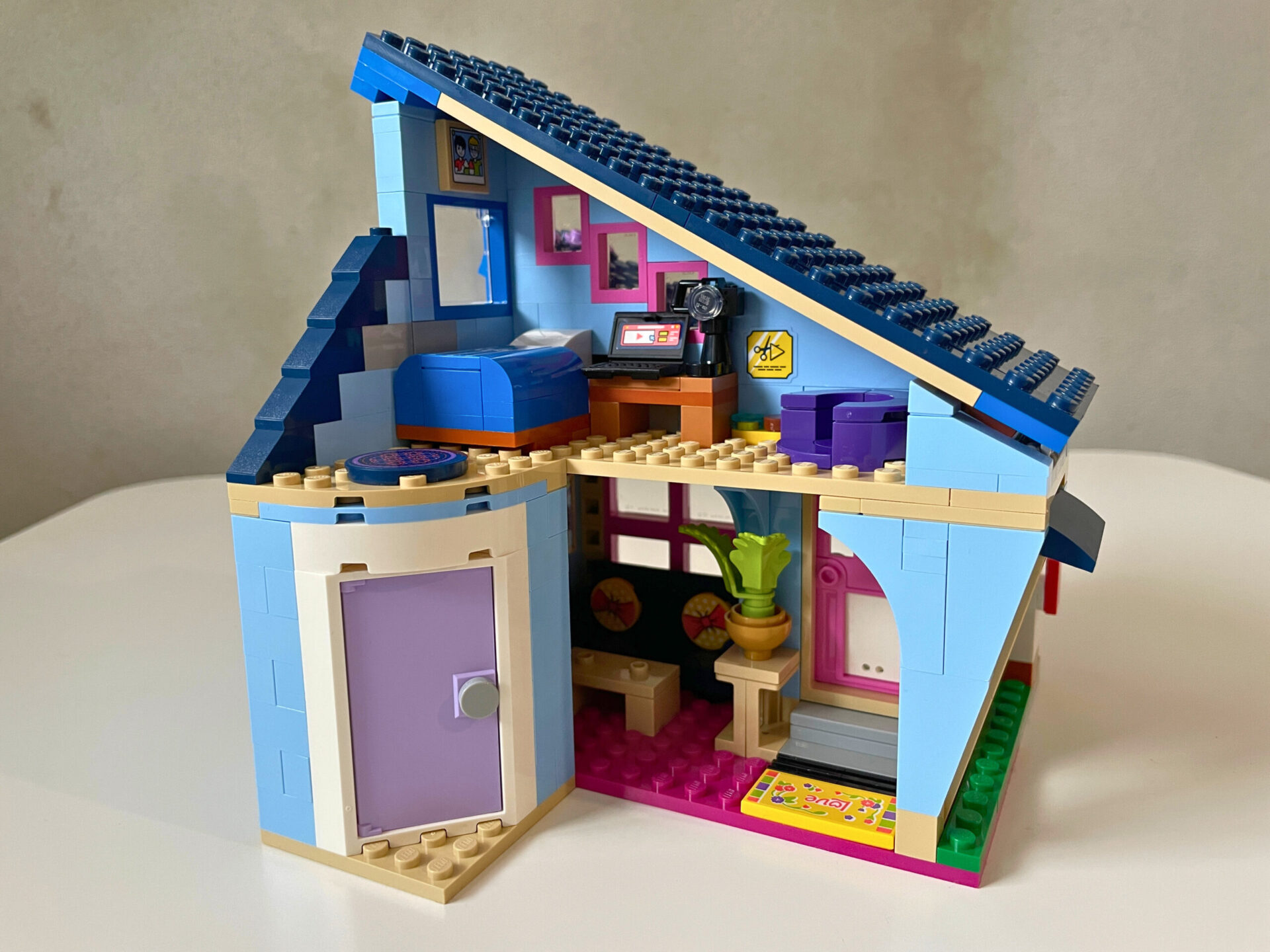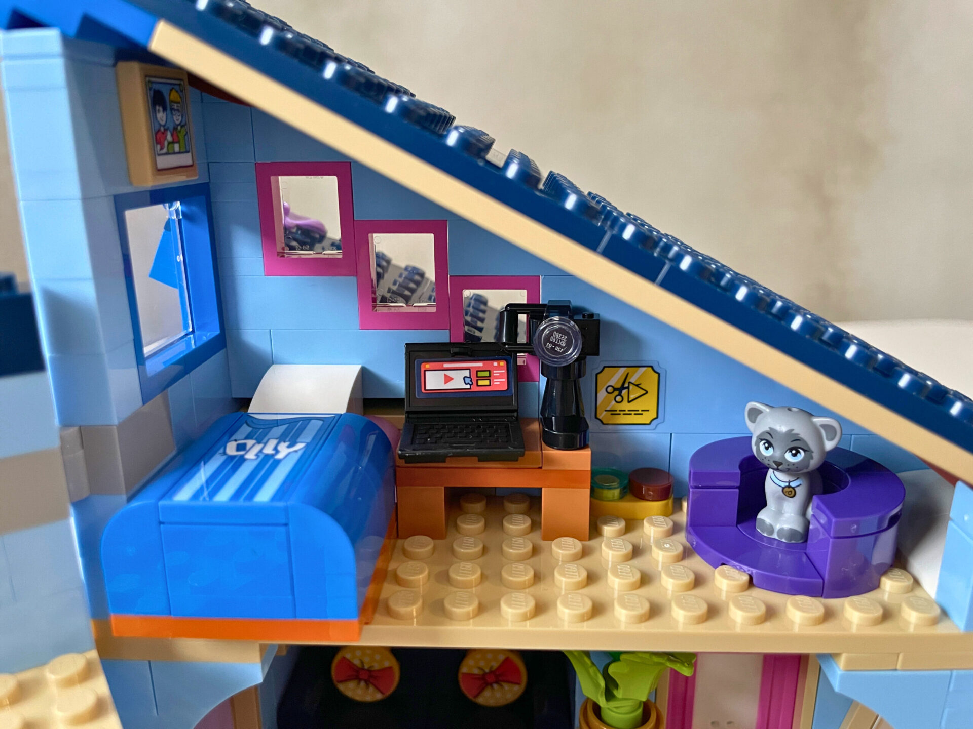 Ollyho ložnice je účelně zařízena a využívá každý kout podkrovní místnosti. V pokoji je vše, co tenhle mladík potřebuje – postel, pracovní stůl s notebookem a kamerou pro streamování a pelech pro kočku. Po odebrání postele odhalíte chytře schovaný šuplík s Ollyho poklady. Obě šikmé střechy lze odklopit a dostat se tak do interiéru. Celkem běžný vzhled domku oživuje jedna nakloněná fasáda, do které je chytře vsazeno velké okno. Rodinný dům má celkem dva vchody, z nichž jeden nabízí kočičí dvířka. Okolí dotváří kvetoucí rostliny, kousek chodníku, poštovní schránka a ministavbička, která je nejspíš zahradním trpaslíkem.