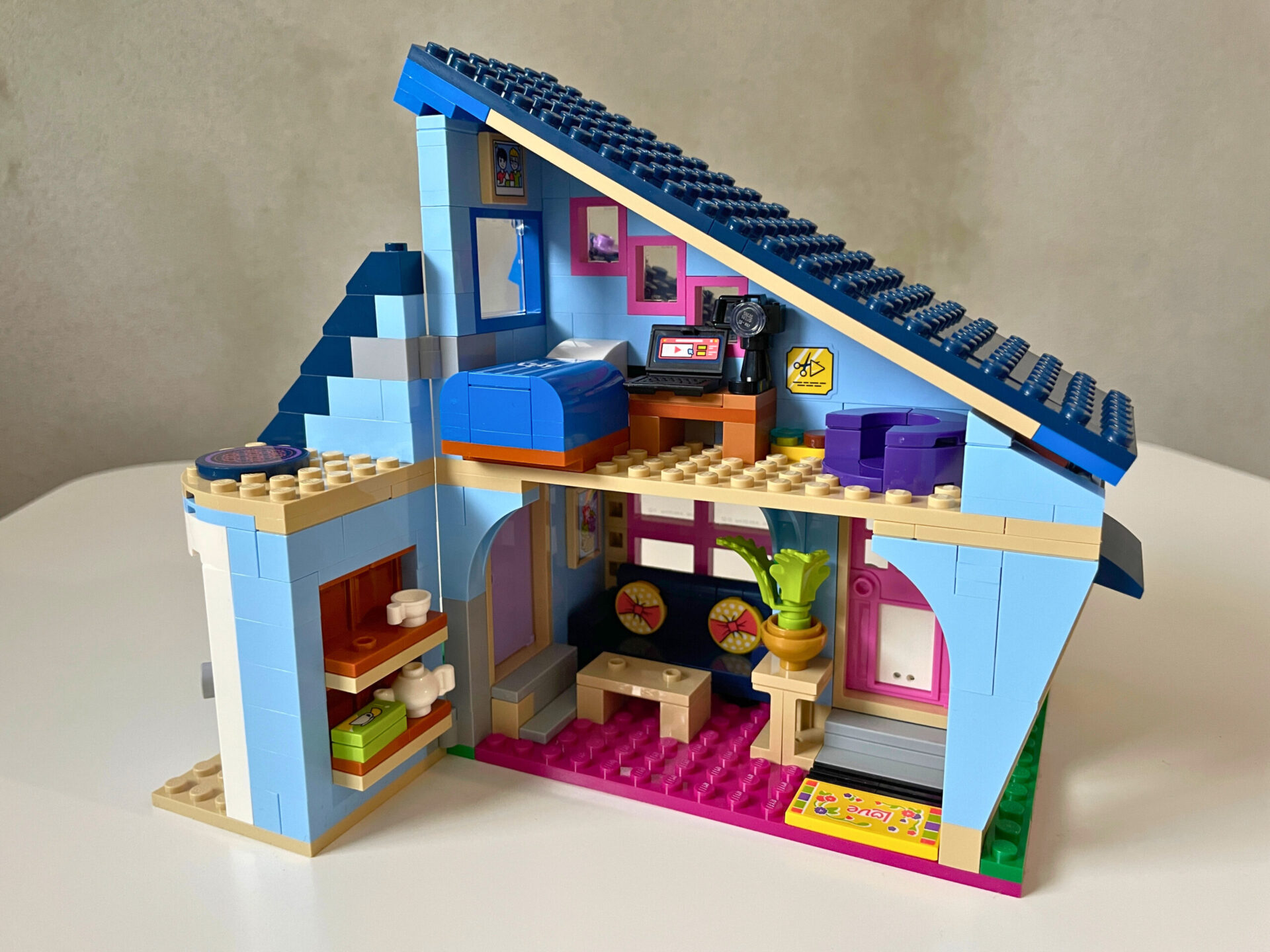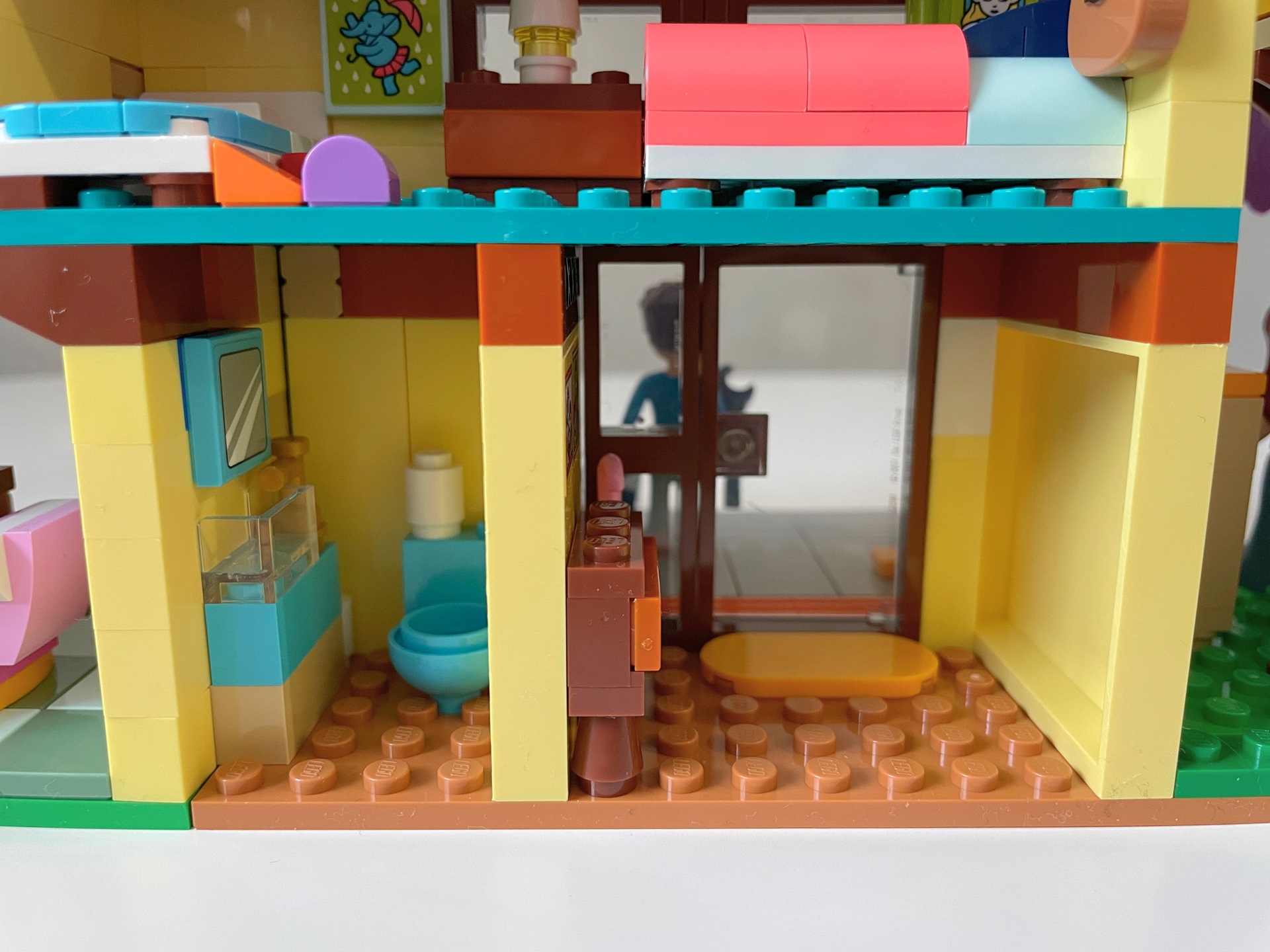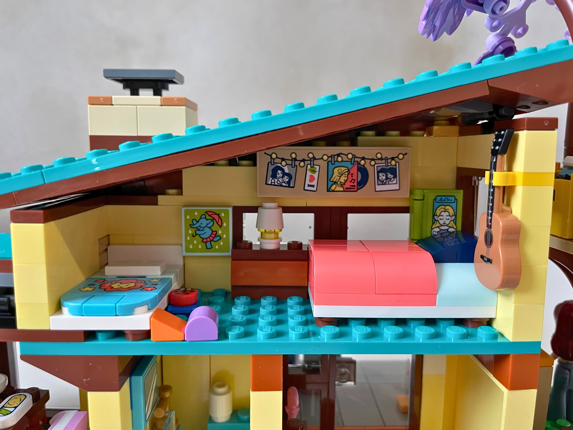 Druhý z domů je o něco rozlehlejší. Dvoupatrovou stavbu obývá otec Jonathan s dcerami Paisley a Ellou. V přízemí našla své místo předsíň, toaleta a kuchyně s jídelnou. Protože je prostor extrémně stísněný i pro drobné dětské ruce, museli autoři stavebnice přijít s chytrým řešením. Moduly s kuchyňskou linkou a jídelním stolem lze z prostoru vyjmout a hrát si s nimi vedle. V místnosti pak zbude jen krb, televize nad ním a kalendář na stěně. Protože je Ella ještě malá, má u stolu moc hezky postavenou dětskou stoličku. Pokoj v podkroví společně obývají obě dcery. Proto v něm najdeme jak hračky pro malou Ellu, tak kytaru a knihy starší Paisley. Na rozdíl od prvního domu, nelze v tomto případě střechu odklopit a ani zde není ukryto žádné překvapení. Dostat ruce do horního patra pro mě bylo opravdu složité.