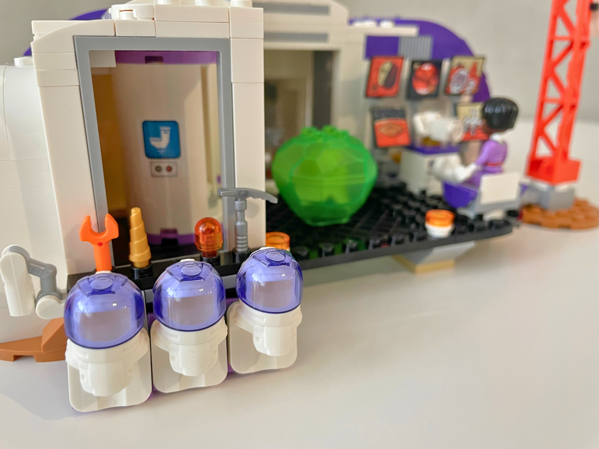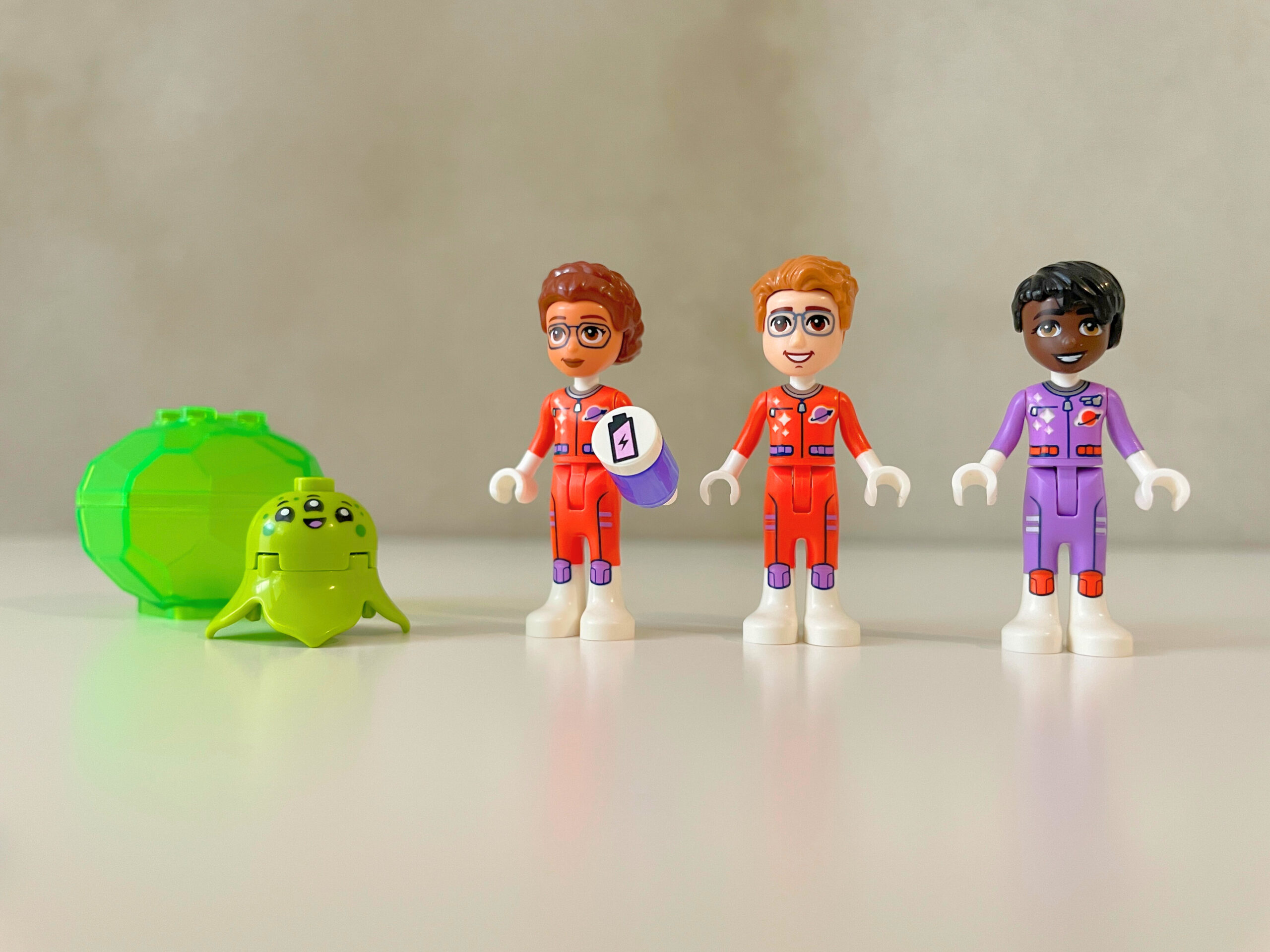 Posádku základny tvoří 3 minidolls jménem Olivia, Aveline a Julian. Podle barev uniforem lze poznat, že Olivia s Julianem právě přiletěli na Mars, zatímco Aveline už tam nějakou dobu pobývá. Všechny figurky mají velmi povedený potisk. Je zajímavé, že postava nazvaná Olivia byla obsažena i v loňském vesmírném setu, který jsem zmiňoval v úvodu. Podle obrázků se mi ale nezdá, že by šlo o tu stejnou osobu. Nebo možná Olivia za rok zestárla kvůli náročnému výcviku. Lidskou trojici doplňuje kočka s kosmobrýlemi a ještě podivný tříoký mimozemšťan v průsvitně zelené skořápce. Jeho přítomnost mě trochu zaráží. Než jsem na něj v návodu narazil, měl jsem dojem, že se stavebnice snaží o alespoň částečně realistické znázornění budoucího života na Marsu. Chápu, že set je zaměřen na dětské stavitele a tenhle zelený tvor přidá další herní scénáře, ale mně prostě ke zbytku nesedí. Naopak velmi povedené jsou moderně působící skafandry. Pro jejich nasazení je třeba odebrat figurkám vlasy. Škoda jen, že nelze otevřít jejich hledí.