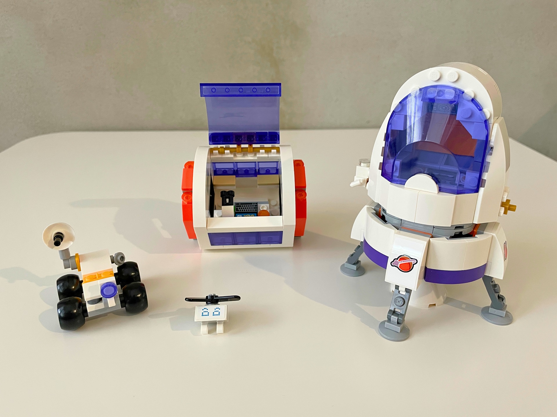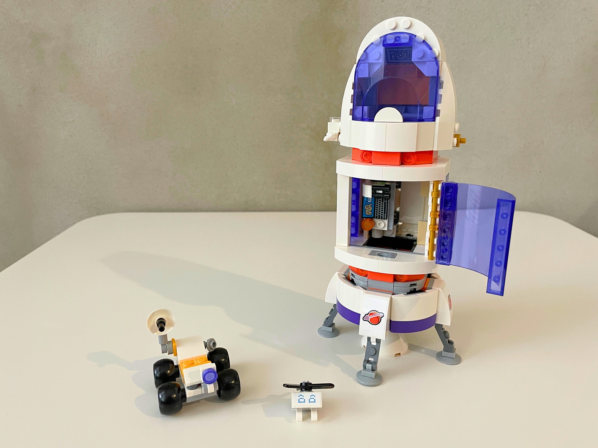 Jako obvykle není první na řadě samotná základna, ale raketa. Už se asi stalo standardem, že nás autoři stavebnic takto napínají a hlavní části modelu nechávají na pozdější dobu. Vesmírná raketa se skládá ze tří částí – motoru, modulu pro uložení roveru a vrtulníčku, který zároveň slouží jako laboratoř, a kokpitu. Kabina pro posádku nabízí místo pro dvě postavy. Upřímně musím přiznat, že nacpat do něj dvě minidolls dalo docela zabrat, ale není to nemožné. Kromě sedaček už je v této části jen ovládací displej. Raketu pohání jeden motor, ve vertikální pozici ji drží čtyři stabilizační nohy. Na výšku měří 20 centimetrů.