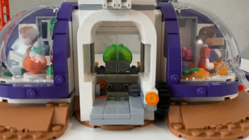 Po raketě přichází na řadu samotná základna a její jednotlivé moduly. V základu jsou 4 a k nim ještě venkovní platforma. Jak už jsem uvedl v úvodním odstavci, díky standardizovanému spojovacímu dílku, bude možné základnu rozšiřovat o další části z jiných sérií. Základem je modul s přechodovou komorou. Díky ní mohou astronauti i zásoby vstupovat z nehostinného povrchu planety do kontrolovaného prostředí základny. Do modulu je vsazen šikovný posuvný mechanismus. Ozubené kolo na vnější straně ovládá pohybující se plošinu, přičemž se efektně otevřou dveře do vnitřních prostor. Za figurkami lze uzavřít těžký vnější poklop a pomocí mechanismu je přesunout dovnitř, což dodává modelu na realističnosti. Tu zase trochu snižuje prosklená kupole na vršku modulu, kterou obývá kočka.