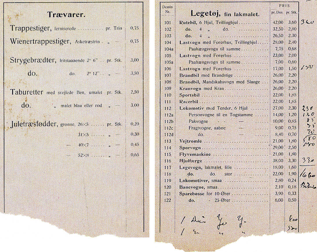I z těchto výrobků mu však zůstala spousta nepoužitelných zbytků a tak aby i je nějak využil, začal z nich vyřezávat miniaturní verze výše zmíněných produktů. Od toho už ke skutečným hračkám nebylo daleko. A právě tento druh výrobku šel zřejmě na odbyt ze všech nejvíce, protože už v prvním roce jich vyráběl přes 20 různých druhů! Na hračky se pak v dalších letech soustředil čím dál tím více, na ceníku z roku 1934 níže můžete vidět, že zatímco dřevěných produktů nabízel jen pár (na levé straně), hraček (na pravé straně) měl v nabídce podstatně více. A o jaké se konkrétně jednalo? Zejména o takové, které by dnes zapadly asi do série LEGO City – autobusy, náklaďáky s přívěsem, hasičské stříkačky, autojeřáby, osobní auta, lokomotivy, tramvaje, letadla i parníky.