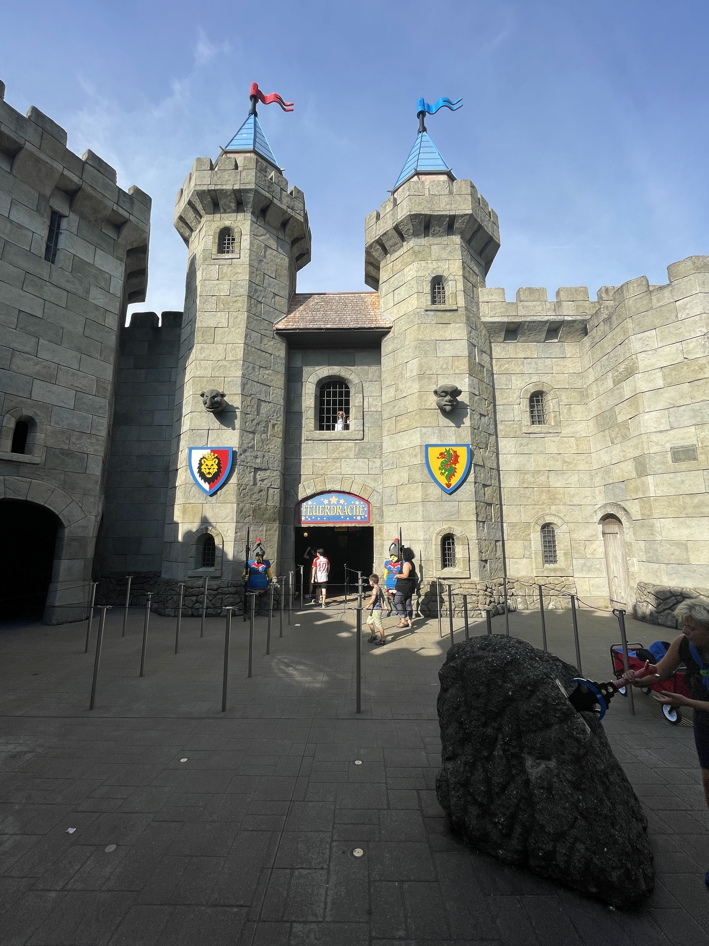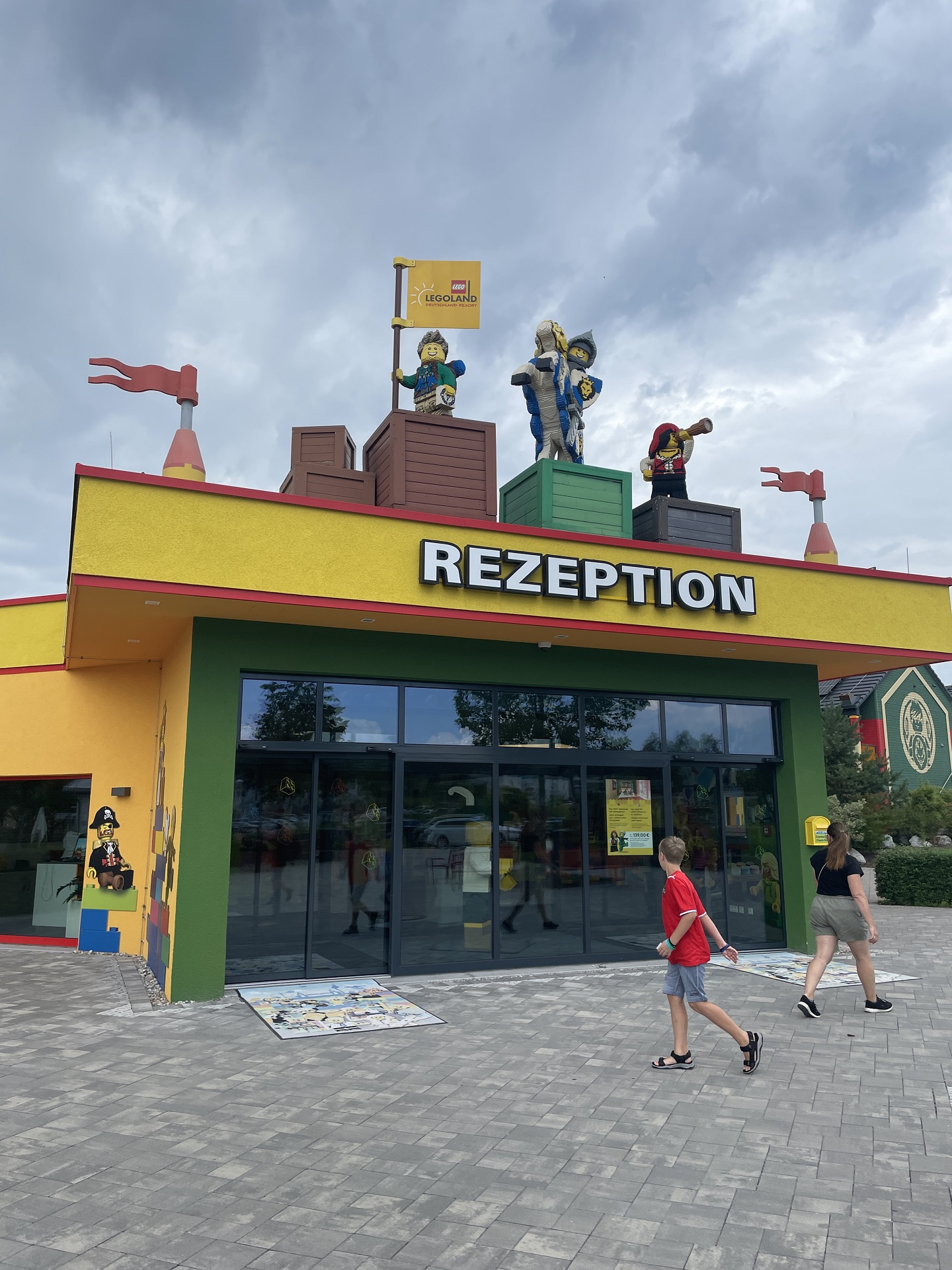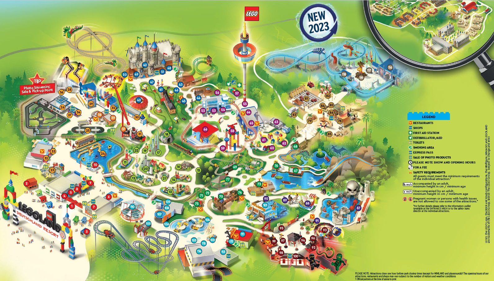 Po příchodu ke vstupní bráně vás může překvapit nezvyklý šrumec a šílené fronty. Brzy ale zjistíte, že ty tvoří právě lidé, kteří nechali nákup vstupenek na poslední chvíli. Když se přes ně dostanete, čeká vás už jen bezproblémový průchod turnikety. Na rozdíl od některých jiných parků, v Legolandu absolutně neřeší, co si do areálu přinesete. Jídlo a pití na celý den v přenosném chladícím boxu? Není problém. Ani různé vozíky pro děti a kočárky nevadí. Hned za branou se po pravé straně nachází toalety, které zachrání plné močové měchýře po dlouhé cestě. U nich si také můžete vyzvednout mapku celého areálu v několika jazycích. Na nás zbyla jen německá verze, ale i s tou jsme si poradili.