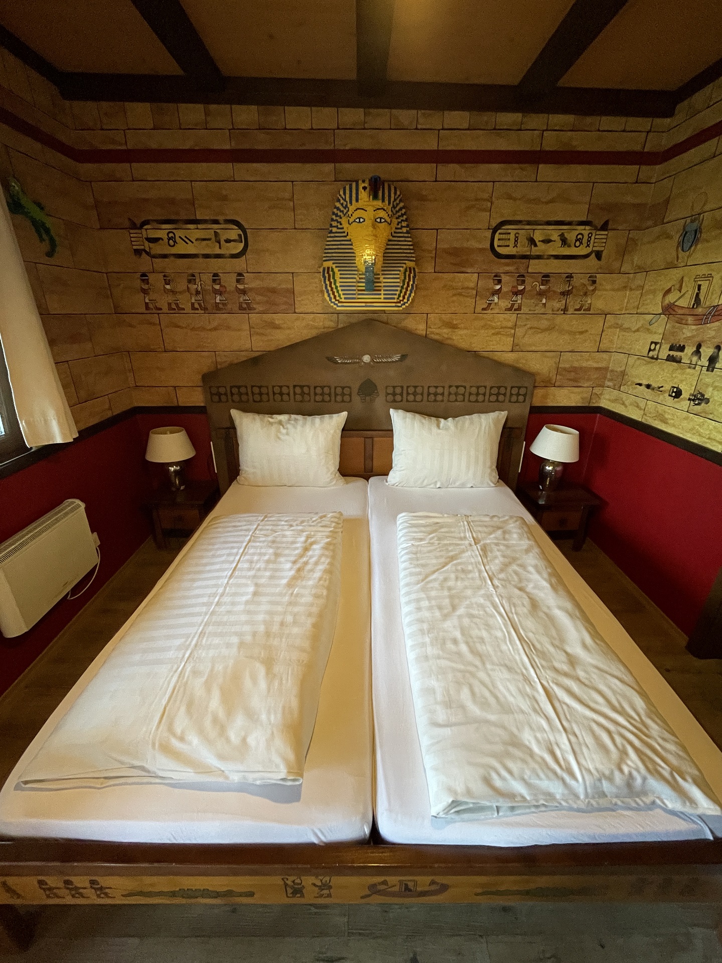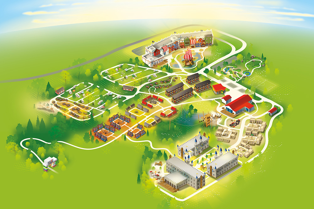 Vesnička nabízí hned několik typů ubytování. Úplným základem je stanové městečko a místo pro zaparkování karavanu či obytného auta. Další level představují chatičky ve tvaru obřích sudů. Nejlevnější možností, jak mít vlastní koupelnu a toaletu, jsou tzv. tematické domky. Kdo chce ušetřit jako my, nechá výběr domku na náhodě. Za volbu konkrétního tématu se připlácí 25 euro. K dispozici jsou témata Egypt, Rytíř, Dobrodruh a Závodník. Nám byl přidělen domek v egyptském stylu. I přes menší rozlohu jsme v něm našli vše potřebné – ložnici pro rodiče, oddělený dětský pokoj s palandou, ledničku a koupelnu s WC. Samostatným typem bydlení je pak Čtvrť Ninjago. Pokoje v ní nabízí to samé, co tematické domky, ale na rozdíl od nich nestojí samostatně. Jsou to větší patrové budovy. Ubytování hotelového typu poskytují 3 samostatně stojící hrady a jedna velká budova ve stylu pirátského města.