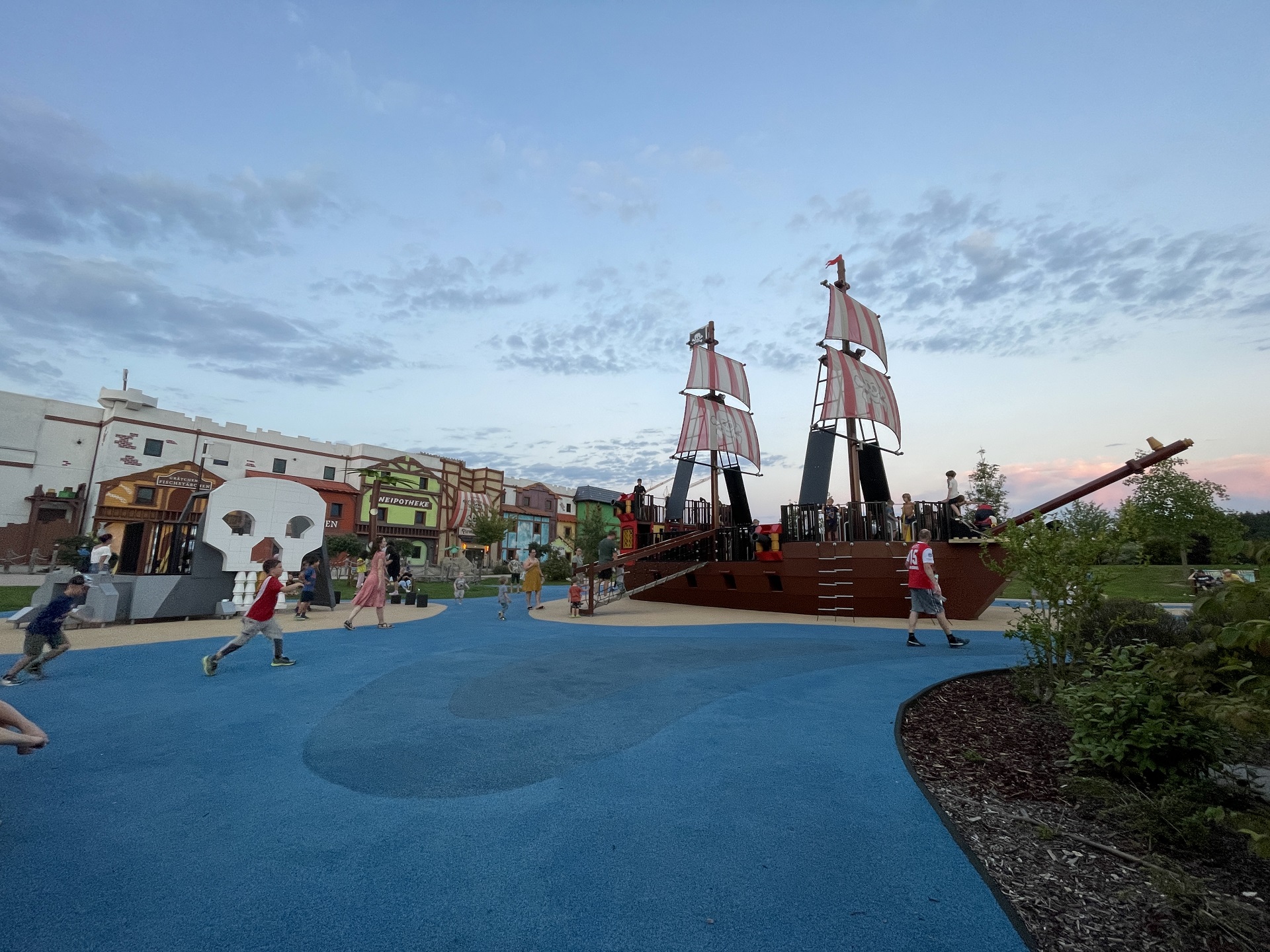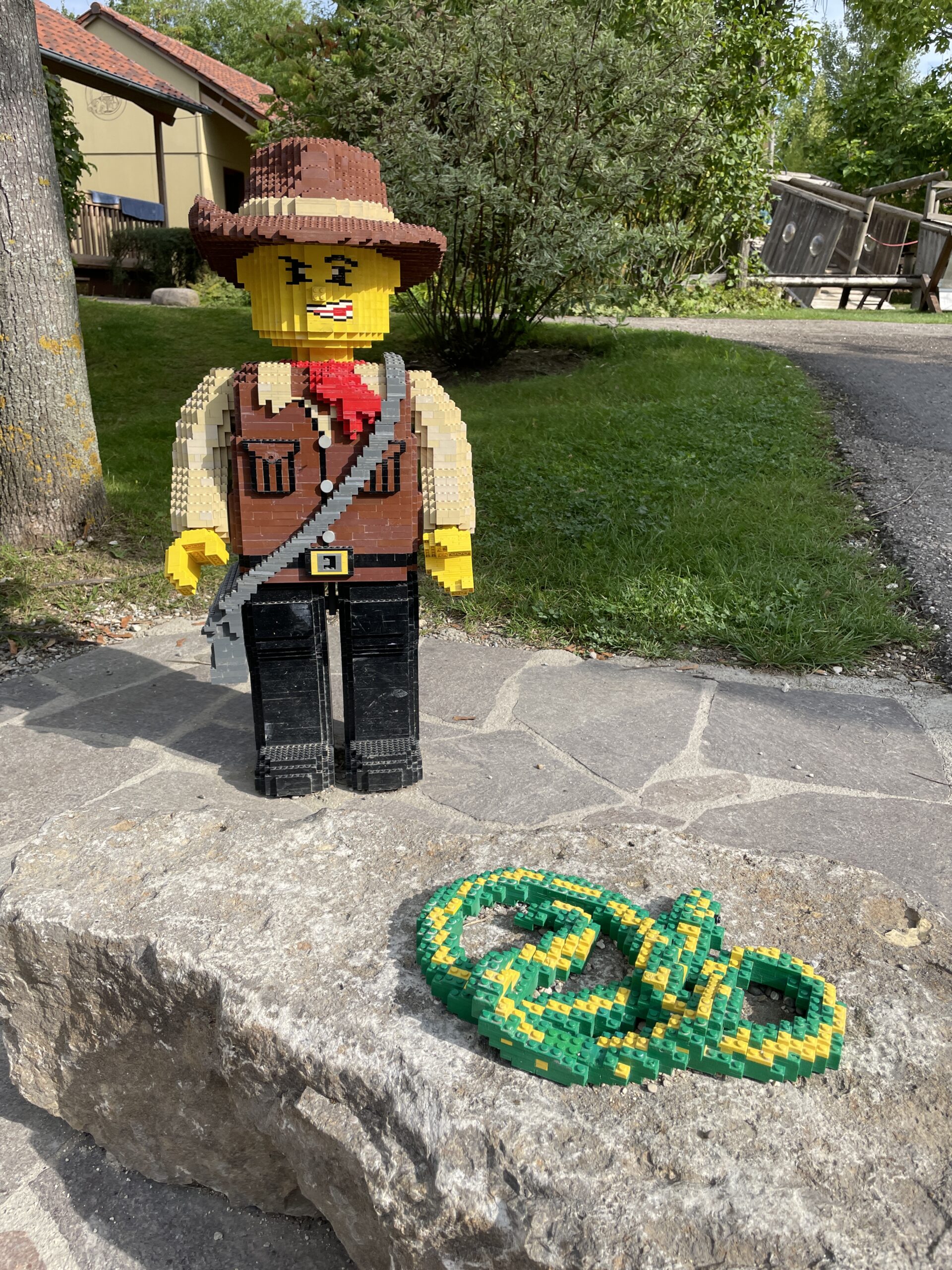 Ubytování ve vesničce má jednu docela slušnou výhodu – vede z ní lesní pěšinka k zadnímu vstupu do Legolandu. Zatímco se většina lidí tísní u hlavní brány do parku, obyvatelé Feriendorfu mohou proklouznout zadním vstupem a postavit se do fronty před všechny ostatní. I přesto, že oficiálně Legoland otvírá v 10:00, zjistili jsme, že minimálně od vesničky do něj lze vstoupit o desítky minut dříve. My jsme toho druhý den využili a dostali se tak celkem svižně na šlapací auto, které jede na kolejnicích nad parkem. Normálně se na něj čekalo minimálně hodinu.