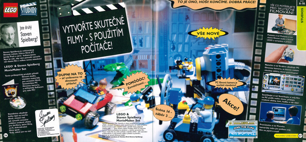 Další z nápadů, které přineslo nestabilní období na počátku tisíciletí, je LEGO filmové studio, které bylo podle mě naprosto přelomovým nápadem, který, narozdíl od ostatních tehdejších novinek, krásně zapadal do LEGO Systému. Jeho podstatou byl hlavní set se stavebnicí filmového studia, USB kamerou a CD se střihačským softwarem. Díky tomu jste si již před dvaceti lety mohli doma vyrábět své vlastní LEGO stop-motion filmy. Marketingové materiály navíc vybízely děti k tomu, aby k natáčení filmů využily stavebnice které již doma mají a zachycovaly tak příběhy, které s nimi prožívají. To vše znělo parádně a sám jsem dokonce tuto stavebnici od rodičů dostal, mé nadšení však opadlo když jsem zjistil, že ukázkové filmy nebyly vytvořeny přiloženou kamerkou, protože její kvalita byla bohužel otřesná. I tak se ale dle mého názoru jednalo o revoluční nápad, který bohatě rozšířil možnosti hry s kostkami LEGO v době, kdy byly fotoaparáty v telefonech teprve žhavou novinkou.