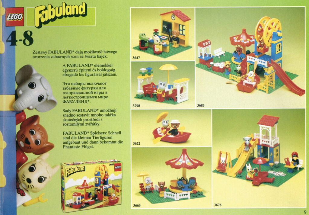 Tato série, kterou LEGO Group vyráběla mezi lety 1979–1989 byla v mnoha ohledech přelomová. Jednalo se nejen o vůbec první produkt LEGO, který měl dětem usnadnit přechod ze systému DUPLO na klasický LEGO systém, ale také o první řadu, jejíž postavy měly jména a která byla dokonce podpořena televizním seriálem. FABULAND měl svůj vlastní svět připomínající dětské televizní pohádky, který byl tvořen v základu díly vyrobenými speciálně pro tuto řadu. Tyto součástky byly větší než klasický LEGO Systém a zároveň menší než LEGO DUPLO. Dnes tuto úlohu plní stavebnice „4+”, nejedná se však o samostatnou tematickou řadu, nýbrž pouze o označení jednodušších stavebnic v rámci klasických produktových řad LEGO. Tento postup dává pravděpodobně větší smysl, protože dětem nenabízí jen stavebnice se zvířátky, ale téměř kompletní tématické portfolio LEGO od City přes Friends až po Star Wars. I přesto si ale myslím, že milá poetika FABULANDu byla jedinečná a zřejmě nejsem sám – řada má totiž dodnes spoustu fanoušků. 🙂